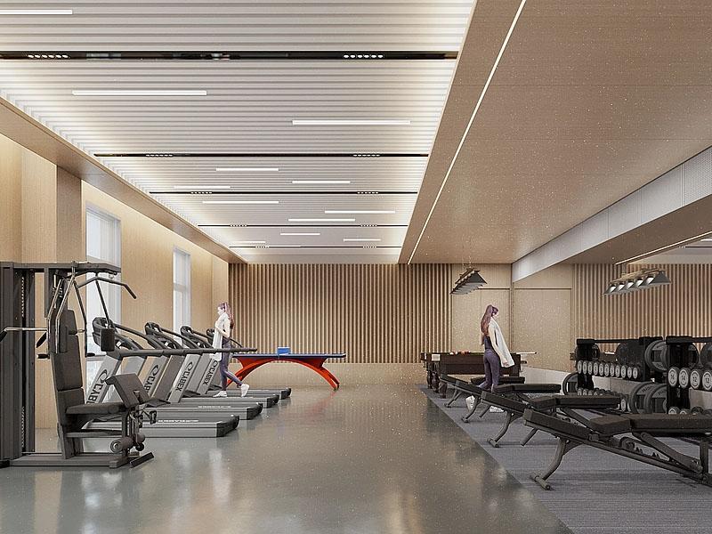 为满足员工的休闲与健康需求,项目打造了专属休闲水吧与健身房。水吧区域以木饰面吧台为核心,搭配嵌入式灯带与简约吧椅,结合饮品柜与咖啡机,为员工提供放松休憩、社交互动的空间;健身房则配备专业健身器材、乒乓球桌与台球桌,以防滑地胶、柔和照明打造舒适运动环境,让员工在工作之余释放压力、强健体魄。