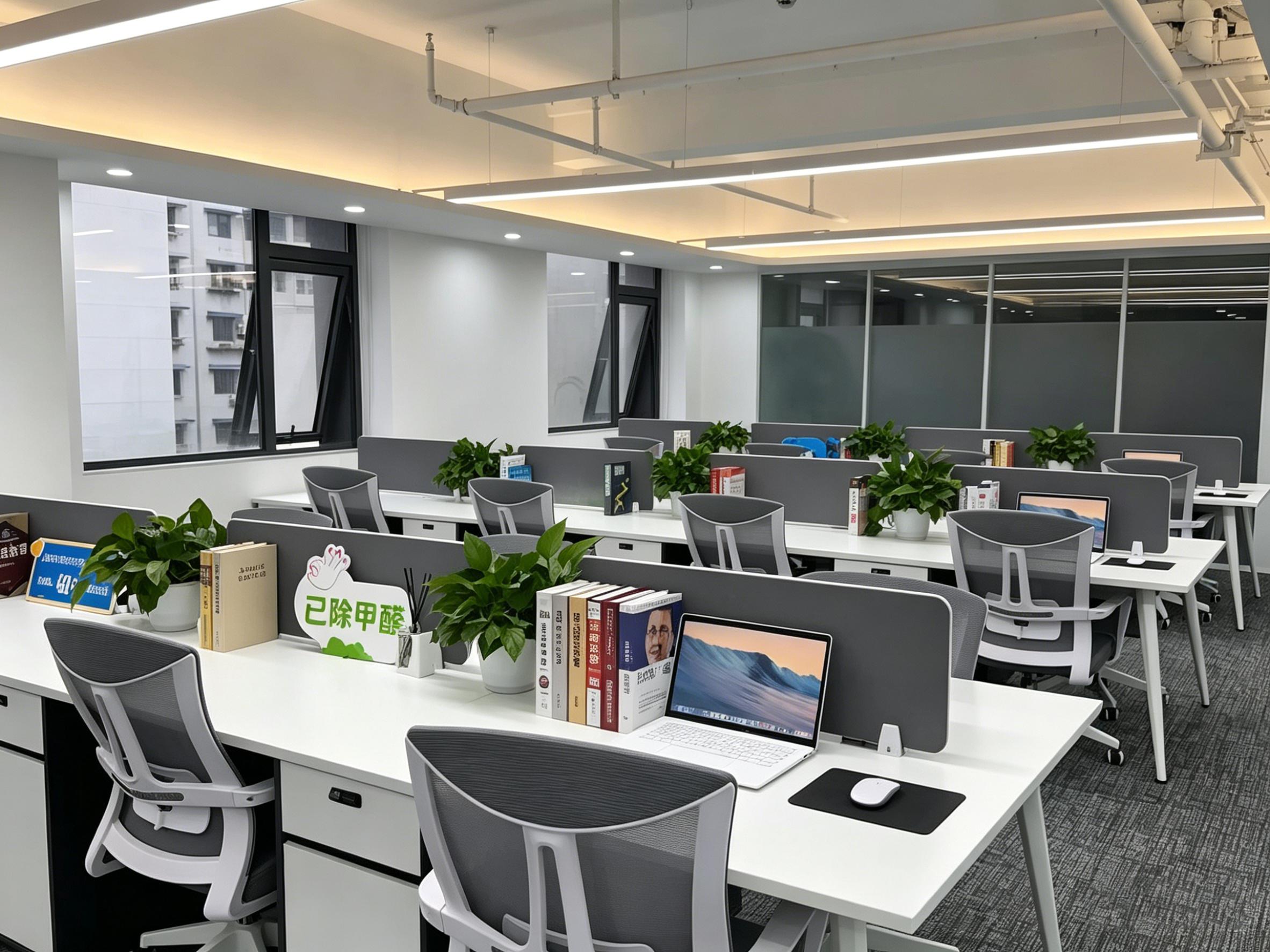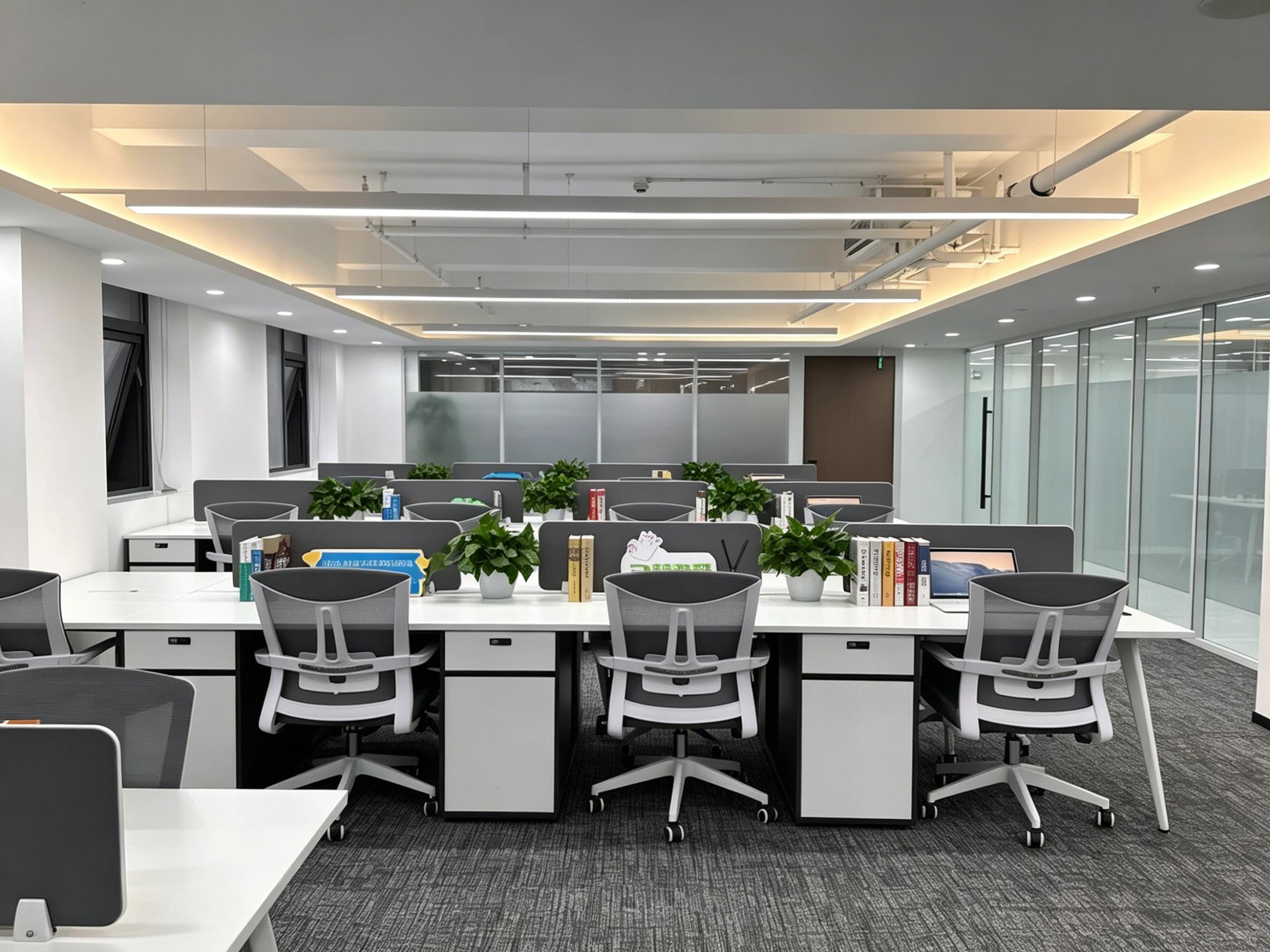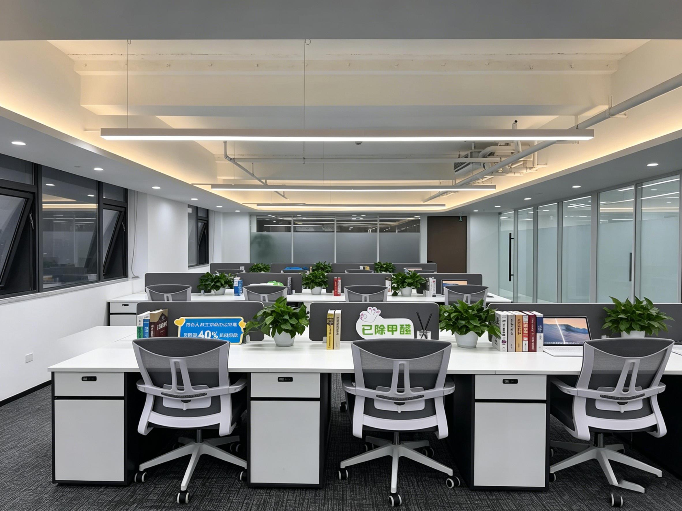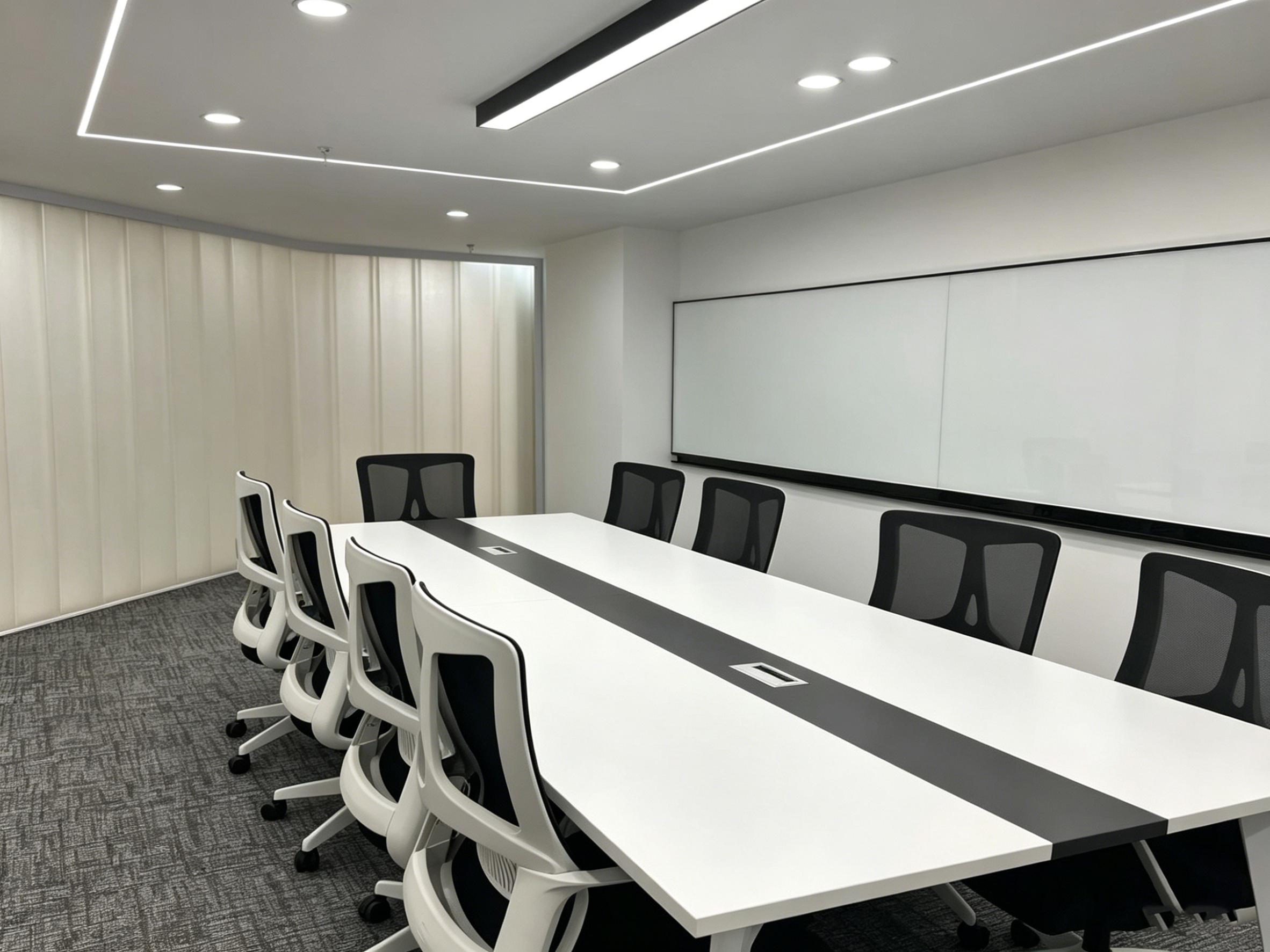 在装修细节上,项目严格遵循现代办公空间的环保与实用标准。地面通铺灰色编织纹地毯,兼具吸音降噪与防滑耐磨特性,为办公环境营造静谧氛围;墙面采用简洁的白色乳胶漆与木饰面结合,弱化空间压迫感,同时提升整体质感;照明系统采用线性灯 + 筒灯的组合,实现无主灯的柔和照明,适配不同办公场景的光线需求;全空间选用环保装修材料,并完成专业除甲醛处理,保障员工健康办公,打造绿色办公环境。