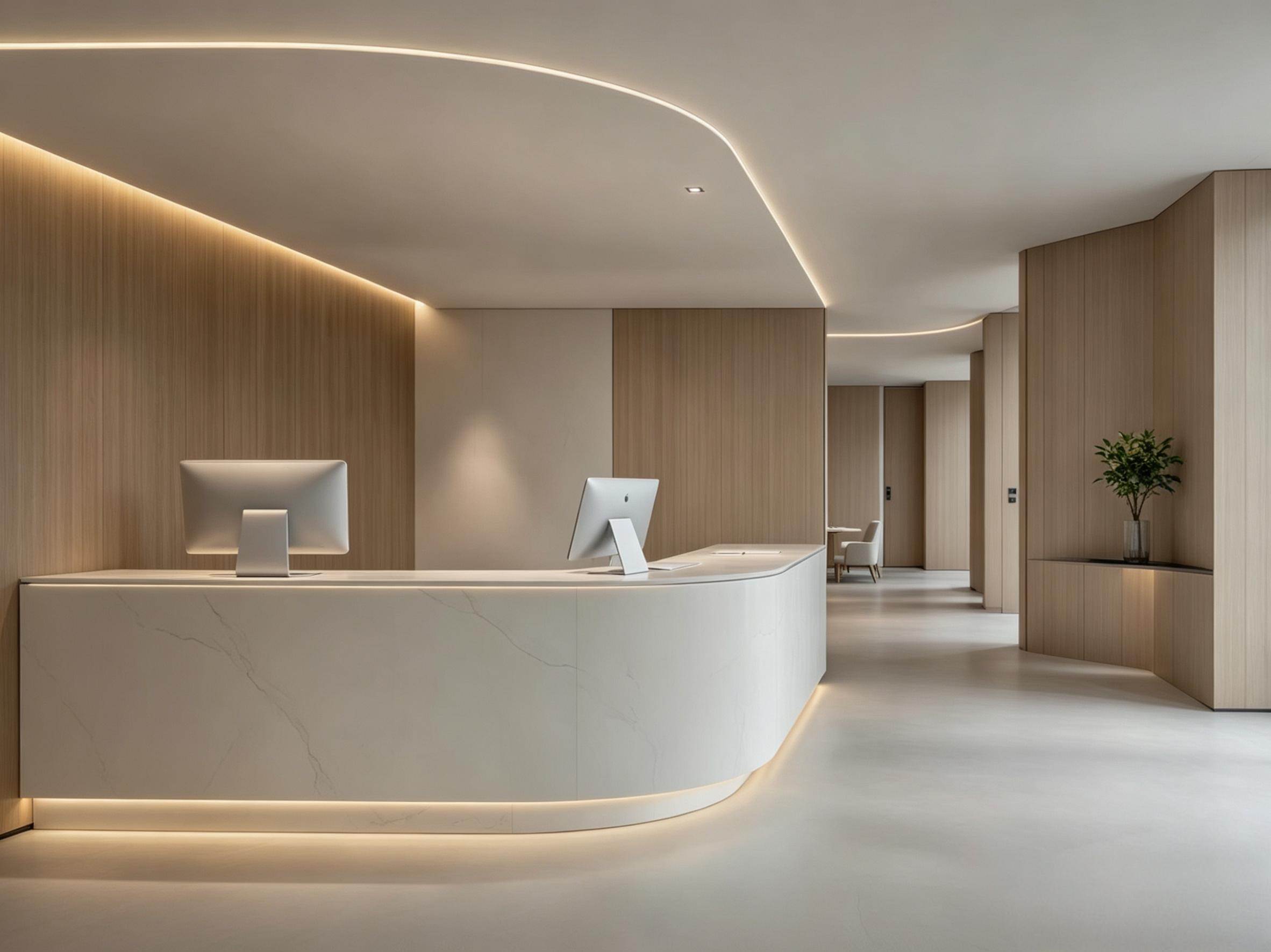 背景墙采用原木饰面与艺术涂料结合,温润的木色中和了白色的冷感,营造出亲和、舒适的接待氛围。无主灯设计搭配线性氛围灯,通过光影的层次变化,让前台区域既明亮通透,又不失静谧雅致,完美契合现代企业的高端形象。