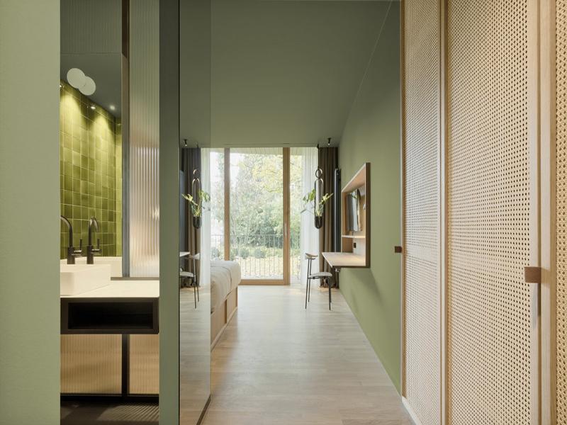 本案以「自然有机 + 现代极简」为核心风格,用低饱和度的鼠尾草绿墙面奠定空间静谧基调,搭配温润原木饰面、藤编穿孔门板,将自然肌理融入每一处细节,既弱化了商业空间的冰冷感,又营造出治愈松弛的旅居氛围。在空间布局上,我们打破传统客房的封闭格局,以长虹玻璃、竖纹玻璃作为功能区隔断,在划分卫浴、睡眠、休憩区域的同时,最大化保留空间通透感,让自然光贯穿全屋,实现「隔而不断」的空间美学。