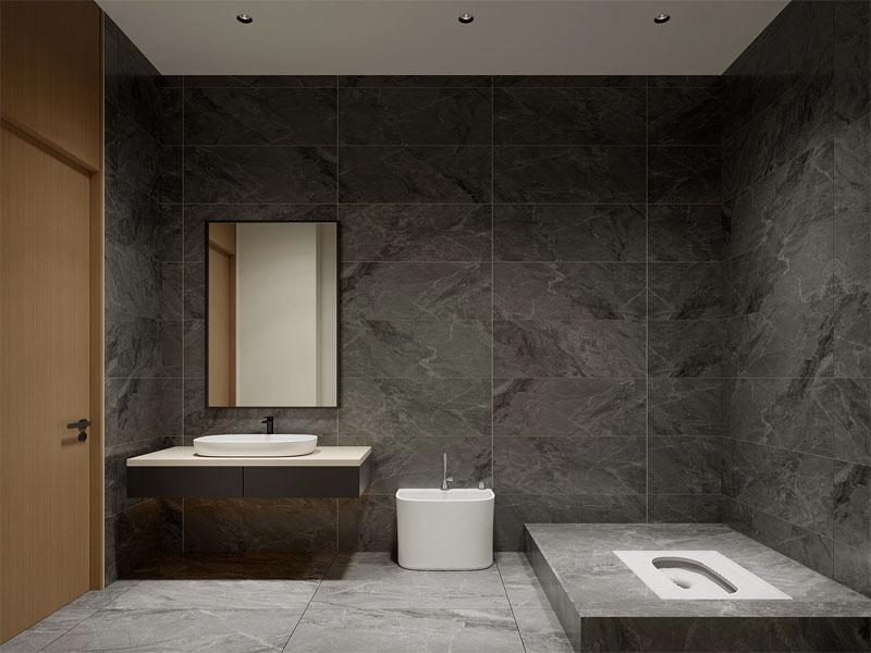 卫生间区域延续了整体设计风格,深灰色大理石瓷砖搭配悬空洗手台,以极简设计打造干净整洁的使用体验,蹲厕与洗漱区的合理分区,兼顾了实用性与美观性,细节处彰显项目的高品质标准。