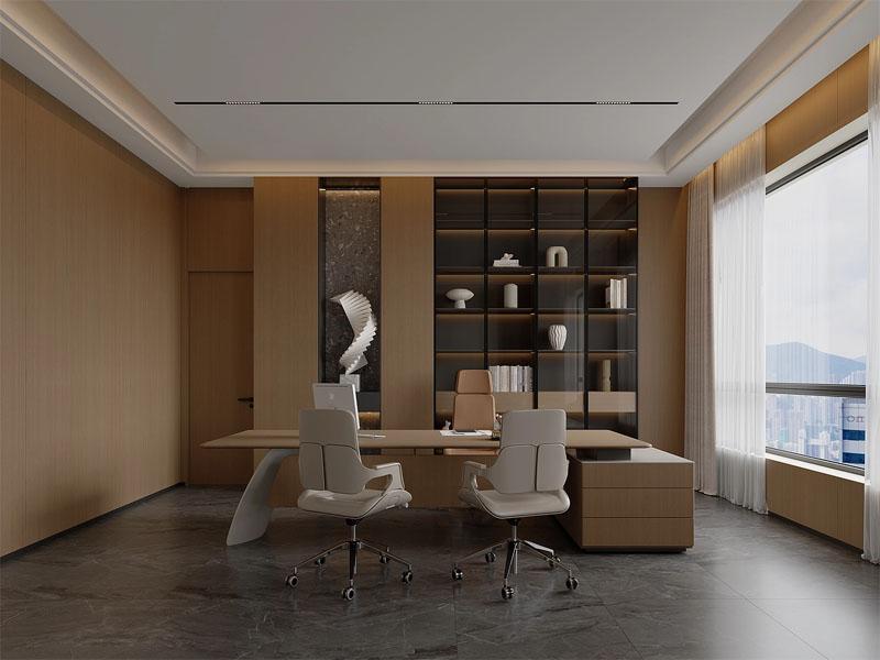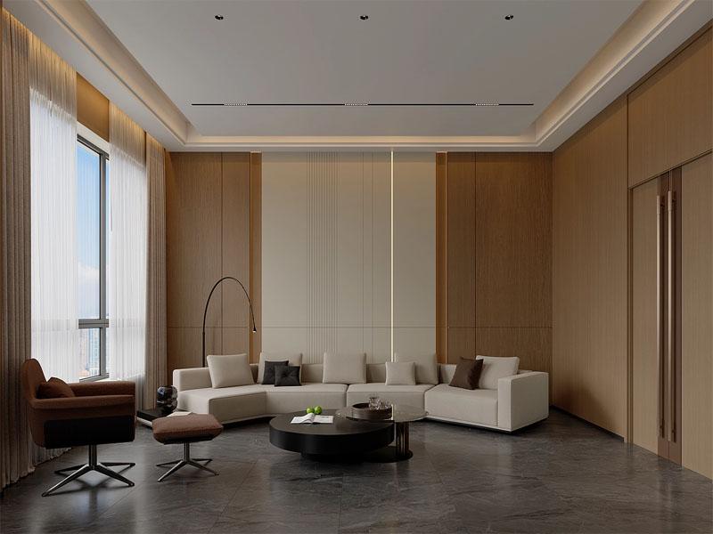项目整体设计遵循「少即是多」的原则,以温润木饰面、高级灰大理石与柔和线性灯为核心元素,构建出沉稳大气、通透舒展的空间氛围。在接待区,弧形组合沙发搭配圆形茶几,以柔和线条弱化空间棱角,木饰面背景墙融入金属线条与暗藏灯带,既提升了空间层次感,也彰显出企业的高端品味;大面落地窗搭配双层窗帘,在保证采光的同时,兼顾了隐私性与氛围感,让访客在舒适环境中完成商务洽谈。