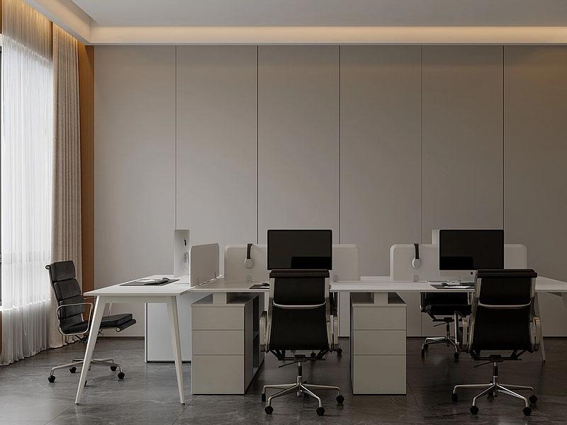 独立办公室则以简约设计凸显专业感,一体化办公桌搭配通透玻璃展示柜,既满足了办公与收纳需求,也通过艺术摆件与书籍陈列,传递出企业的文化底蕴;线性灯与无主灯设计,让空间光线均匀柔和,有效缓解办公视觉疲劳,提升工作效率。开放办公区以白色工位桌为主体,搭配百叶玻璃隔断,在保证空间通透感的同时,实现了工位的独立与隐私,合理的动线规划让员工办公动线流畅,提升协作效率。