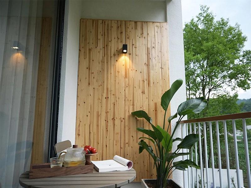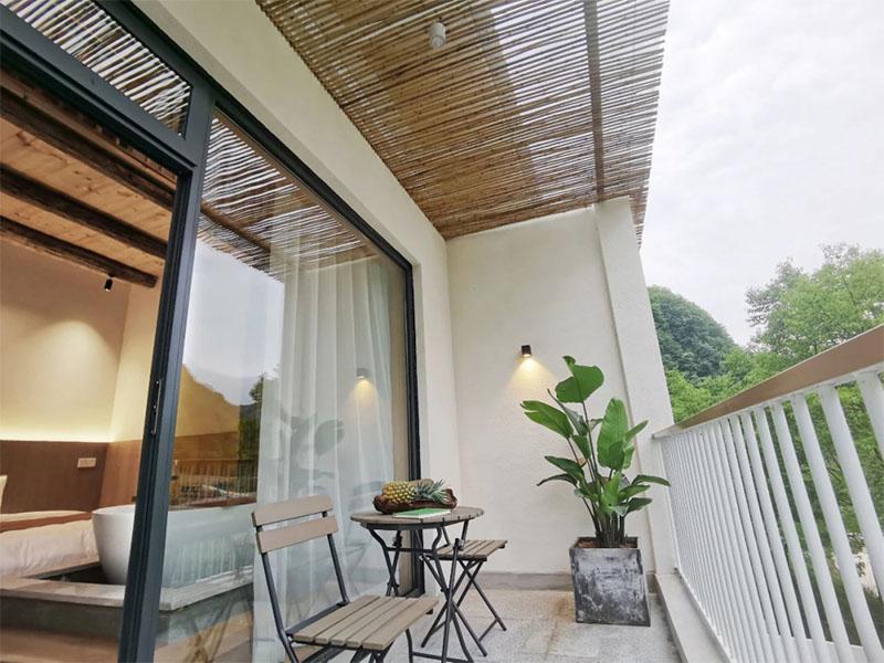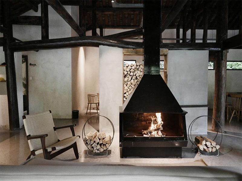 民宿的阳台,则是把山野的惬意延伸到了户外。壹西格玛的设计师用竹编打造了遮阳顶,搭配原木墙面和浅灰色的休闲桌椅,一盆大型绿植在角落舒展枝叶。清晨在这里泡一壶茶,读几页书,傍晚伴着晚风吃一份点心,远处的山林在暮色里渐渐温柔,连时间都变得慢了下来。而民宿的公共区域,保留了老建筑的木质梁柱,搭配黑色的壁炉,粗粝的木材与细腻的墙面形成对比,暖融融的火光,为旅人打造了一个可以围坐交谈、卸下疲惫的温暖角落。