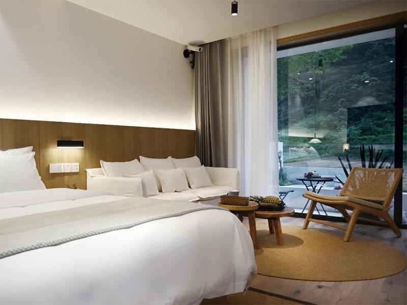推开民宿的客房门,最先映入眼帘的,是卧室里那扇几乎落地的玻璃窗。壹西格玛的设计师没有选择厚重的窗帘,而是用一层轻薄的白纱,让窗外的绿意毫无保留地涌进室内。原木色的床头背景墙搭配柔和的线性灯光,米白色的床品和藤编休闲椅,营造出松弛又温暖的氛围。阳光透过纱帘洒进来,在地板上投下斑驳的光影,窝在藤椅上,就能看见山林间的风穿过树叶,连呼吸都跟着慢了下来。