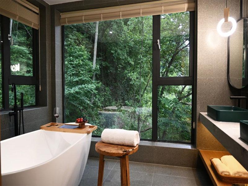 民宿的浴室,更是把“沉浸式自然体验”做到了极致。壹西格玛的设计师用深灰色的哑光瓷砖铺就墙面,搭配质感温润的木质卫浴托盘,白色的独立浴缸正对着整片山林。泡在温热的水里,手边放着一杯红酒和新鲜的果实,窗外是郁郁葱葱的树林,仿佛整个山林都是你的私藏景观。这种“借景入室”的设计手法,让卫浴空间不再是封闭的功能区,而是能与自然对话的疗愈角落。
