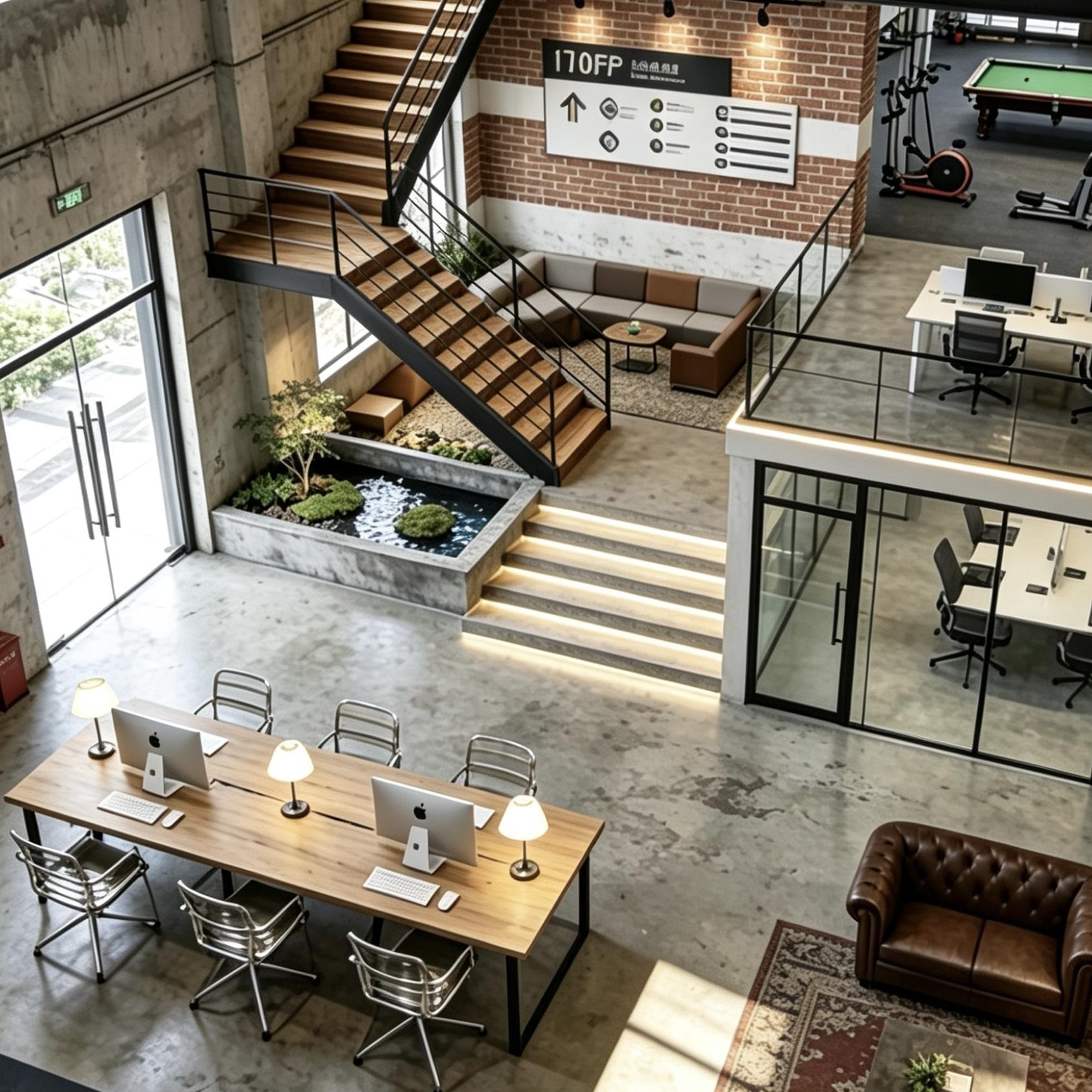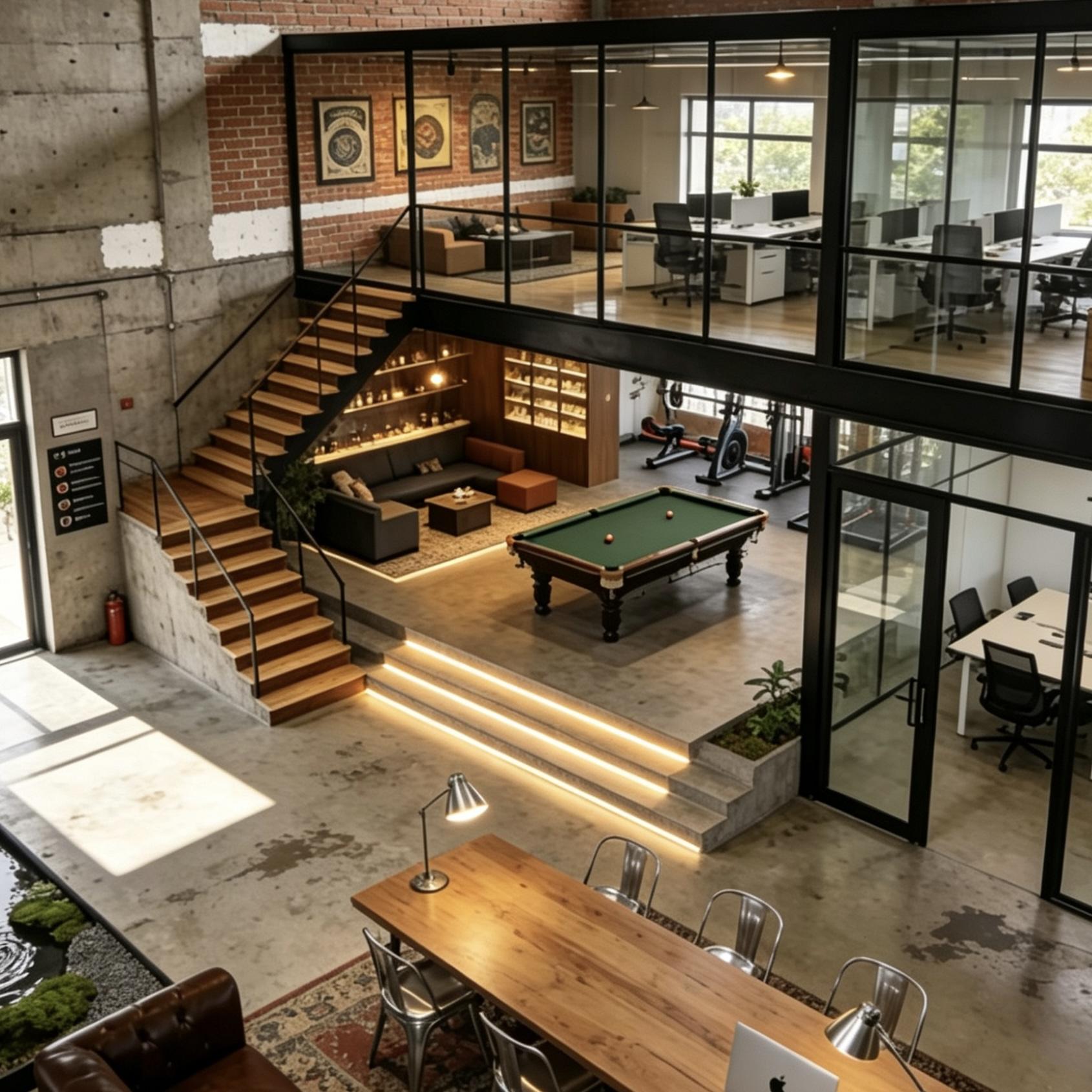 空间分区也完全为办公场景量身定做:开放办公区搭配玻璃隔断会议室,兼顾团队协作与隐私,抬头就能看见窗外的树影;中间的双跑楼梯既是动线,也是整个空间的视觉中心,台阶内嵌的氛围灯一开,粗粝里瞬间多了温柔的仪式感;角落藏着休闲洽谈区、健身区和台球区,累了能瘫在皮沙发上放空,也能打两杆球松松肩颈,办公与松弛完全不冲突;连楼梯下的小水景、角落的鱼缸,都给冷硬的工业风添了点灵气,细节里全是用心。