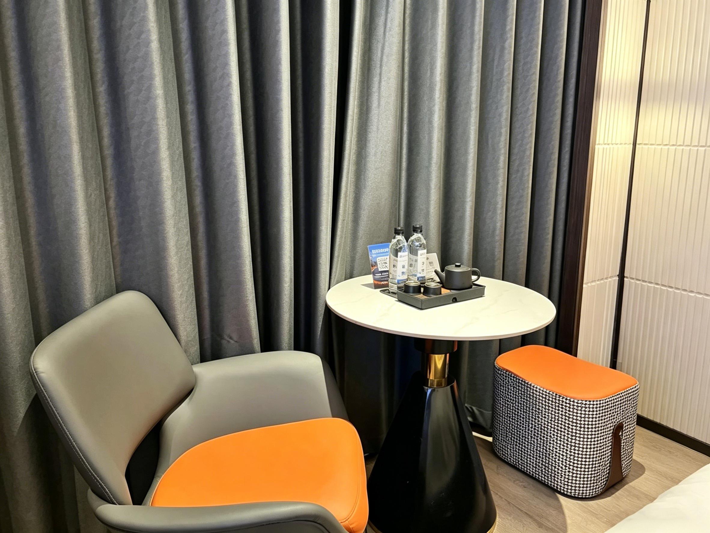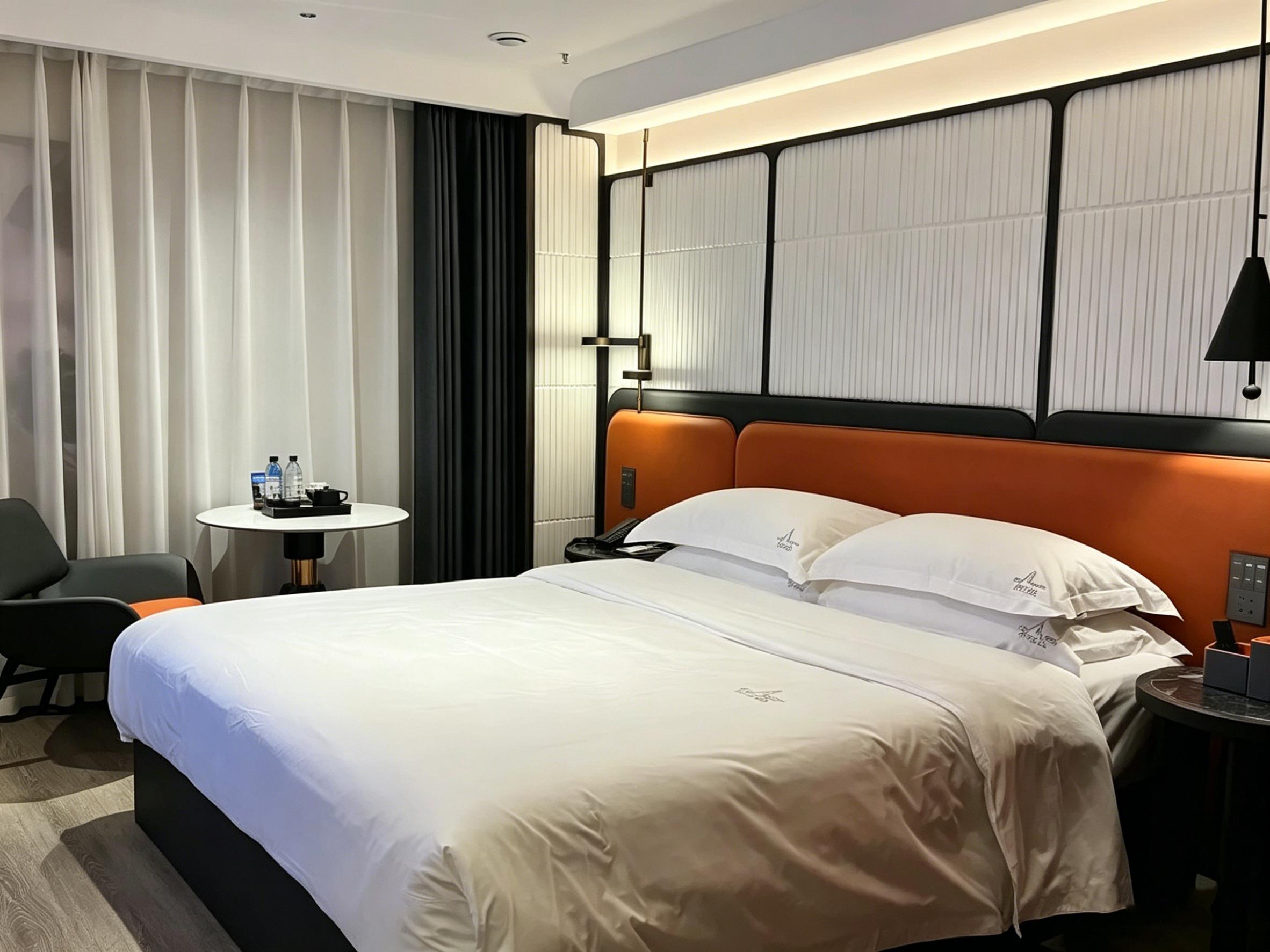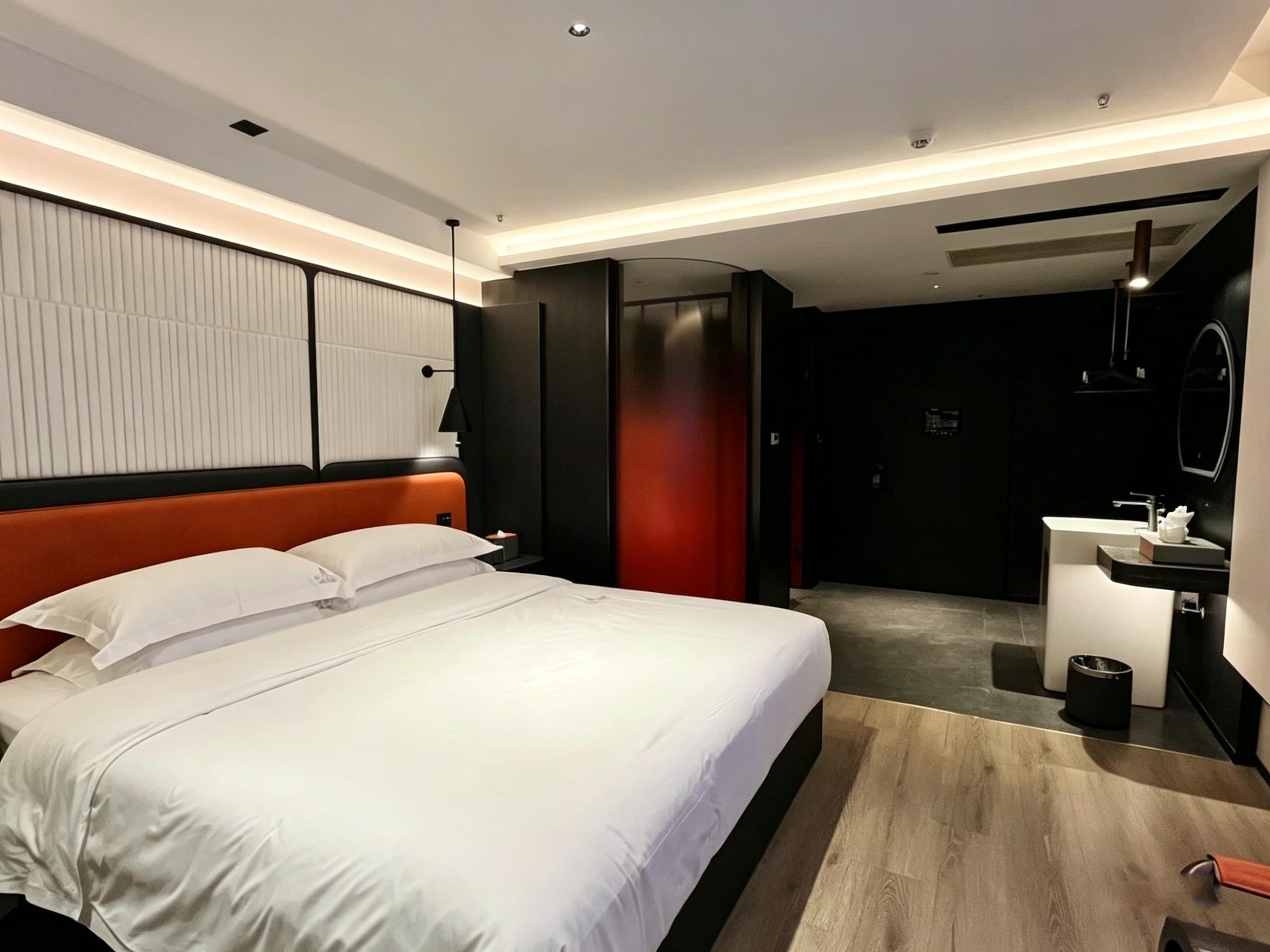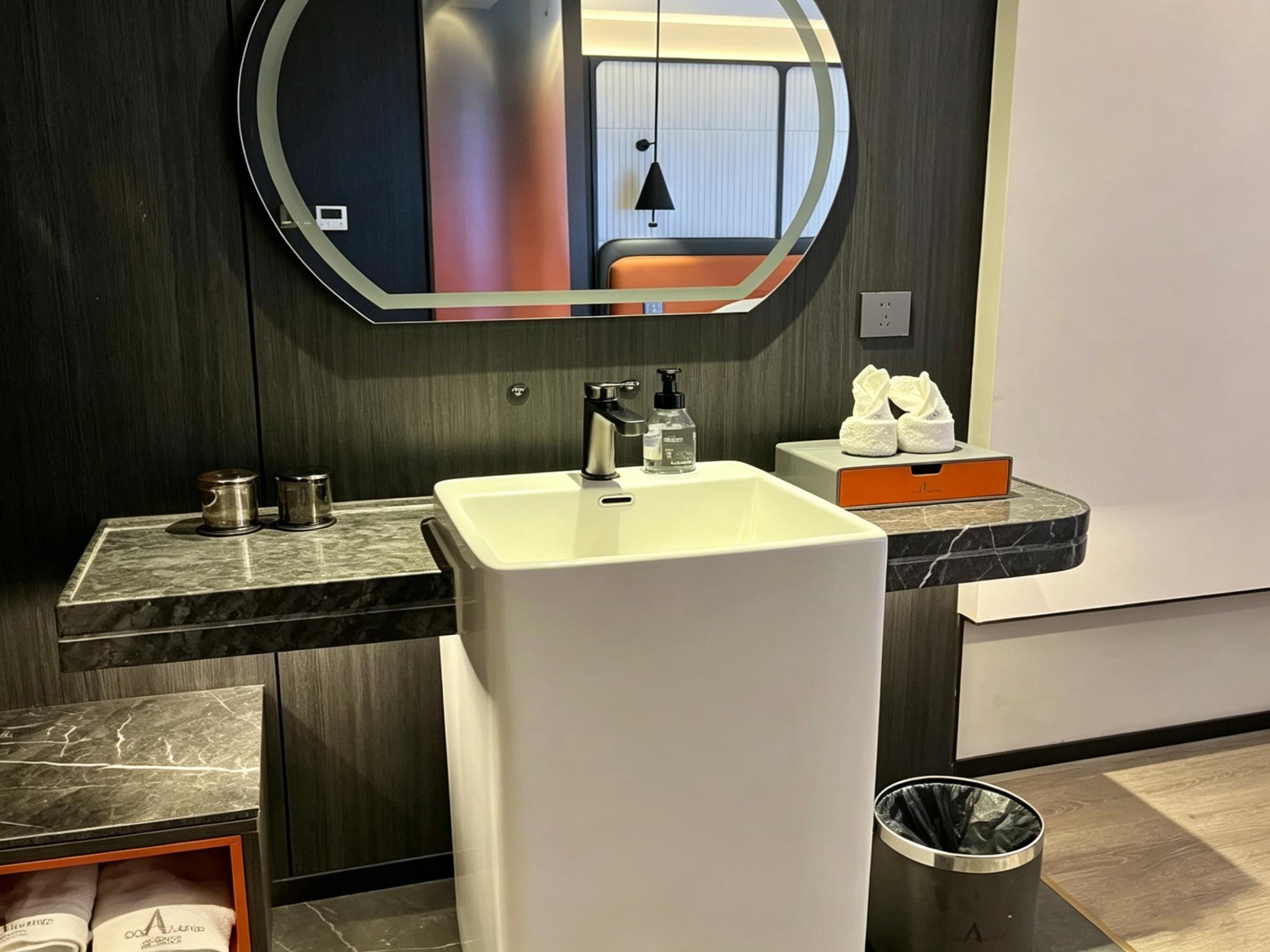 在功能规划上,团队充分考量酒店运营与用户体验的双重需求。客房内的休闲洽谈区以单人沙发与小圆桌打造,兼顾休憩与轻办公场景;卫浴区采用干湿分离设计,渐变玻璃隔断兼顾隐私与通透感;全屋定制的收纳系统与模块化软装,既满足了酒店标准化运营的需求,也让空间呈现出秩序之美。灯光设计上,团队摒弃了单一照明模式,通过磁吸轨道灯、壁灯、镜前灯的组合搭配,营造出多层次的光影氛围,既保障了不同场景的照明需求,也通过光影变化赋予空间更多情绪张力。
