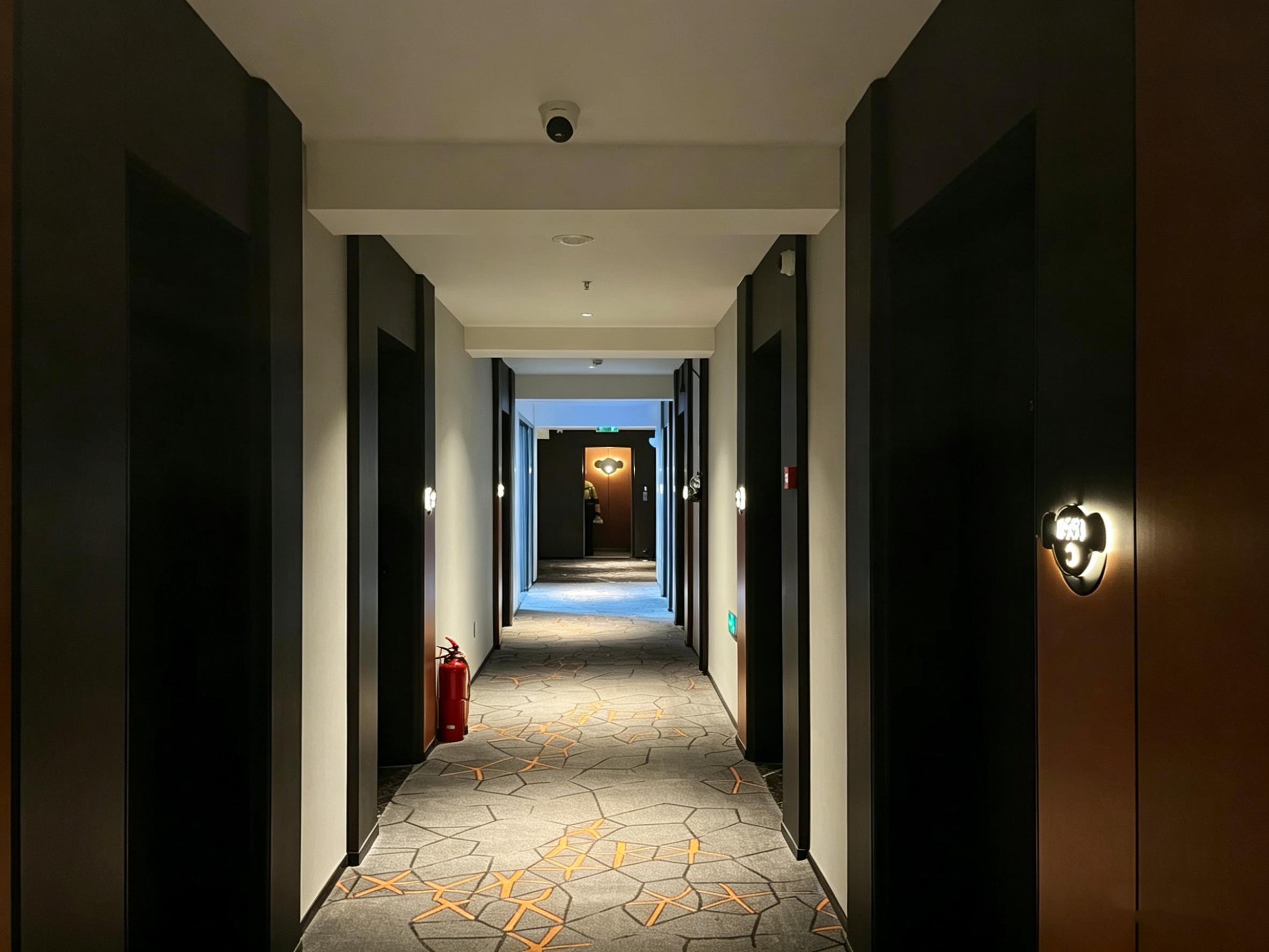 项目以 “低奢现代” 为核心基调,打破传统酒店的刻板印象,通过色彩、材质与光影的精准碰撞,构建出兼具高级感与温度感的空间语境。公共区域的走廊以深棕木饰面搭配暖光壁灯,几何纹理地毯勾勒出空间动线,无主灯设计让光线柔和铺陈,既保障了通行的功能性,也营造出静谧的归家氛围。客房内部则以黑白灰为基底,大胆融入爱马仕橙作为跳色,床头背景墙的竖纹格栅与皮革软包形成肌理对比,圆形镜台搭配大理石台面,将卫浴区的精致感拉满,开放式洗手台设计既优化了空间利用率,也成为客房的视觉亮点。