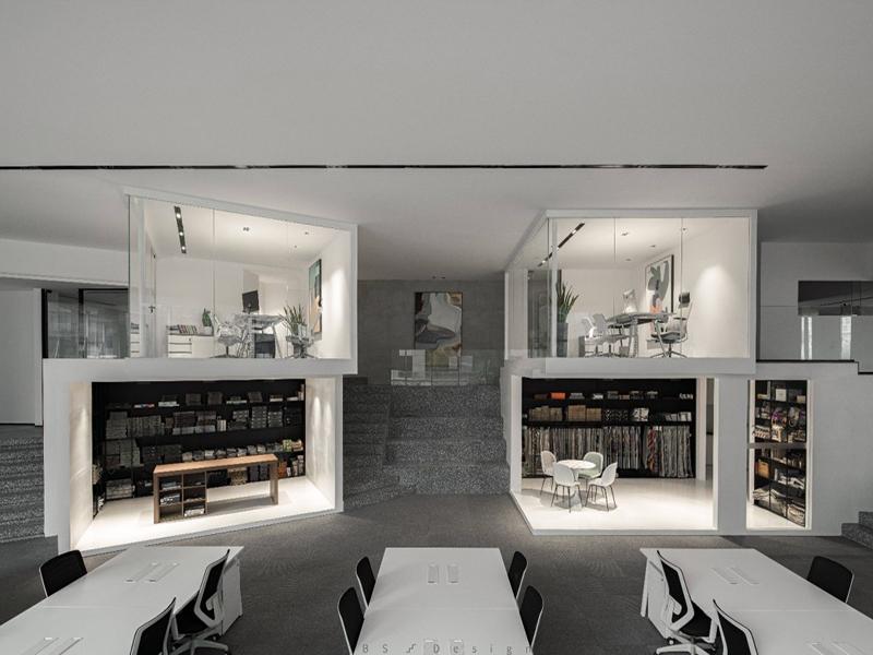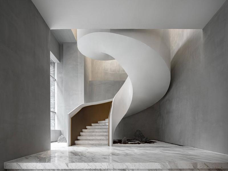 色彩与材质的搭配,始终围绕公装空间的耐用性、专业性与美学性展开。我们以白、灰、黑为基底色调,搭配水磨石、大理石、玻璃与哑光金属等耐磨易打理的公装常用材质,营造出干净利落的工业极简氛围。仅在局部点缀少量金色与亮色,既打破单调感,又不破坏整体的专业气质;一层满墙书架与休闲洽谈区的布局、极简风旋转楼梯与枯山水造景的搭配,不仅弱化了办公空间的刻板感,更让动线本身成为空间的艺术表达,让公装空间既有实用价值,又有美学张力。