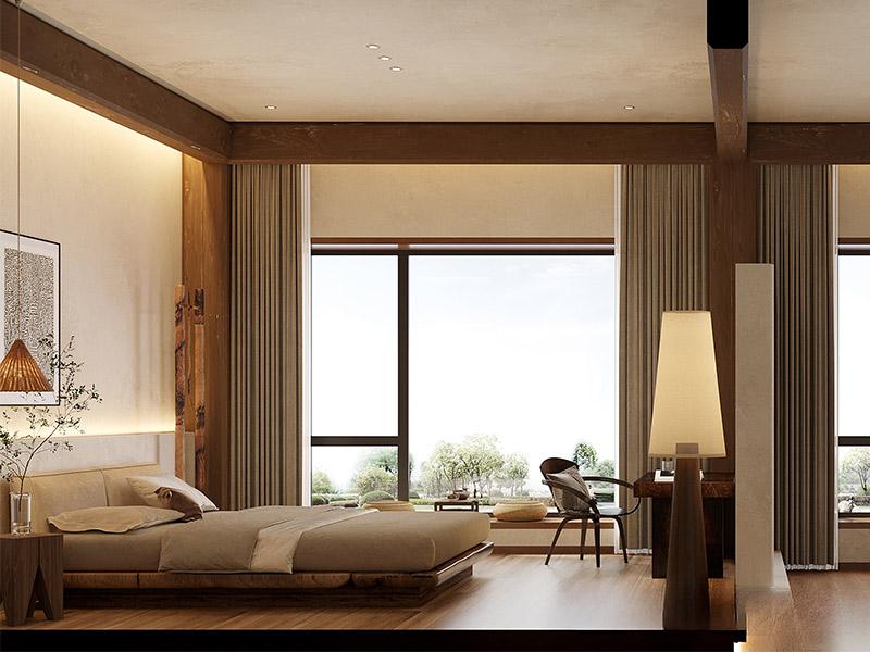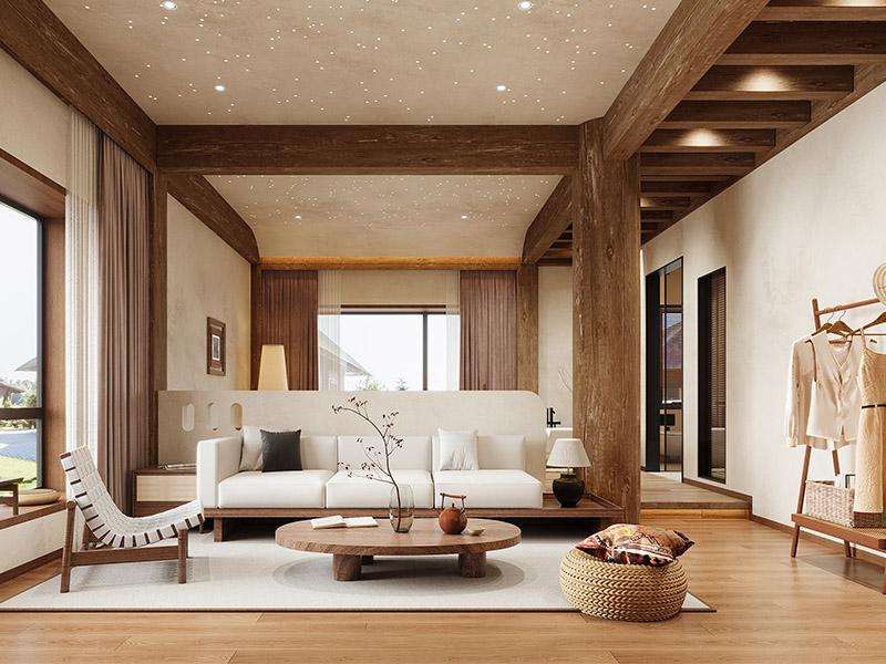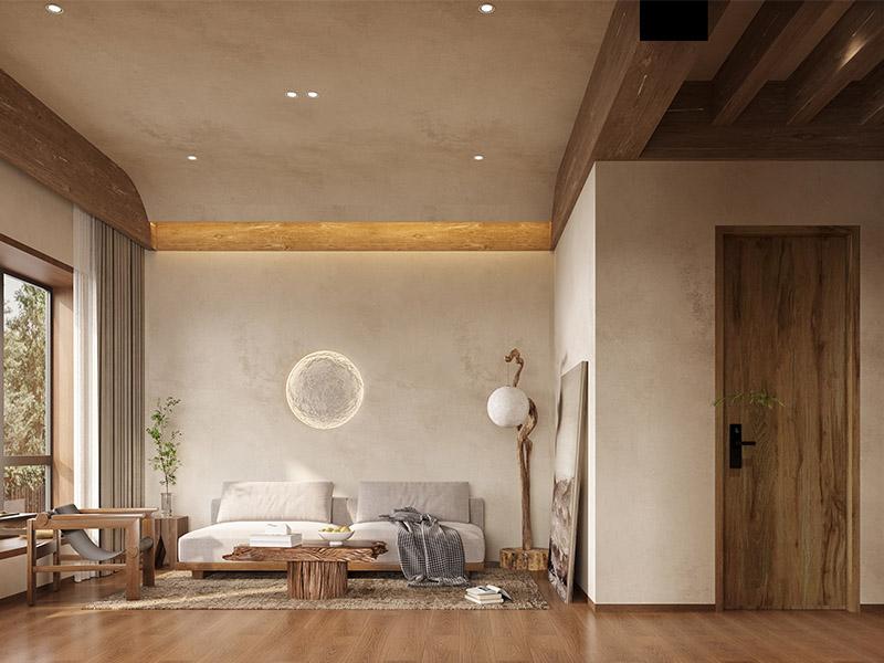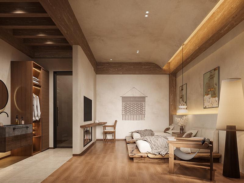 在色彩与材质的把控上,我们拒绝过度装饰,以原木暖棕、米白微水泥为基底,用做旧木梁、亚麻布艺、藤编家具搭建起质朴的氛围骨架,既贴合侘寂风的松弛调性,又通过选品的耐脏性与耐磨度,适配民宿高频次的使用场景,解决后期维护的痛点。