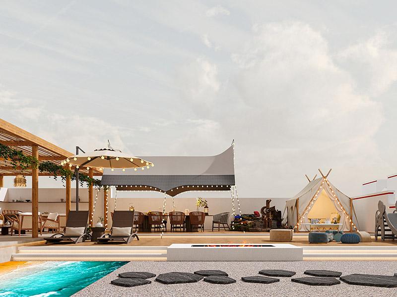 空间规划上,我们打破传统民宿的刻板布局,采用开放式套房设计,将睡眠区、休闲区、迷你功能区温柔衔接,既放大了空间通透感,也满足了住客 “一房多场景” 的体验需求。客厅的星空顶、卧室的嵌入式灯带、户外露台的天幕与篝火台,这些氛围感设计并非噱头,而是结合住客的旅居习惯定制,兼顾拍照打卡的传播属性与日常使用的舒适度。