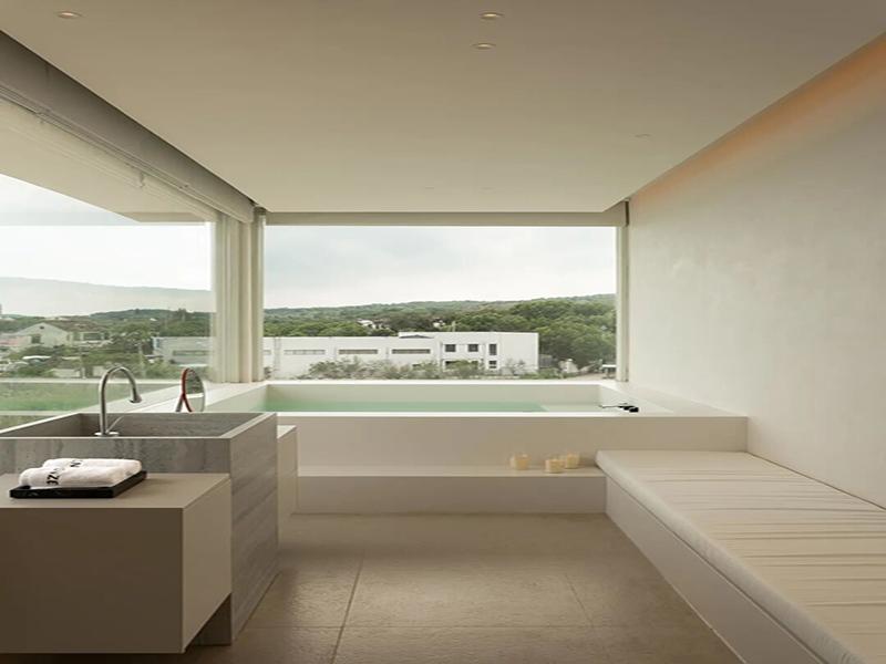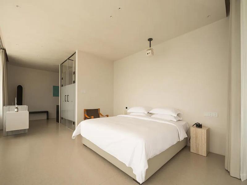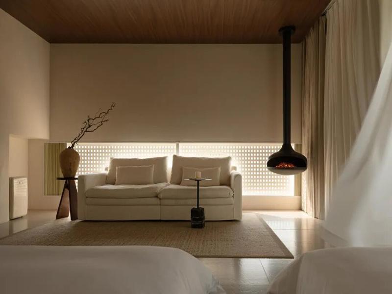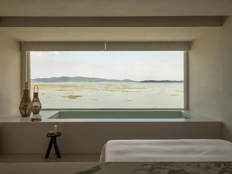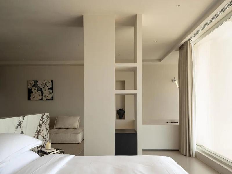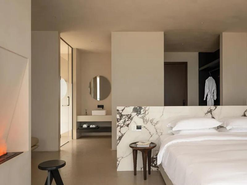客房更是把 “治愈感” 做到了极致。全景落地窗浴缸直面湖景,泡澡时就能把整片水域的温柔拥入怀中;悬浮大理石床头,搭配暖调的氛围灯,夜里也能被稳稳包裹;半透的隔断、格栅窗、悬浮壁炉,每一处留白都在给情绪留足呼吸的空间。