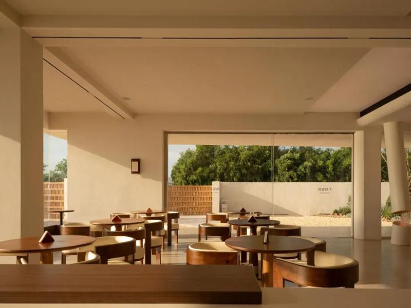 公区的挑高空间里,落地窗成了最好的装饰。阳光穿过玻璃,把户外的绿意揉成流动的光影,落在温润的木质桌椅上,连空气都变得松弛起来。没有夸张的造型,只有线条的克制与光影的流动,让每一个踏入这里的人,都不自觉地慢下脚步。