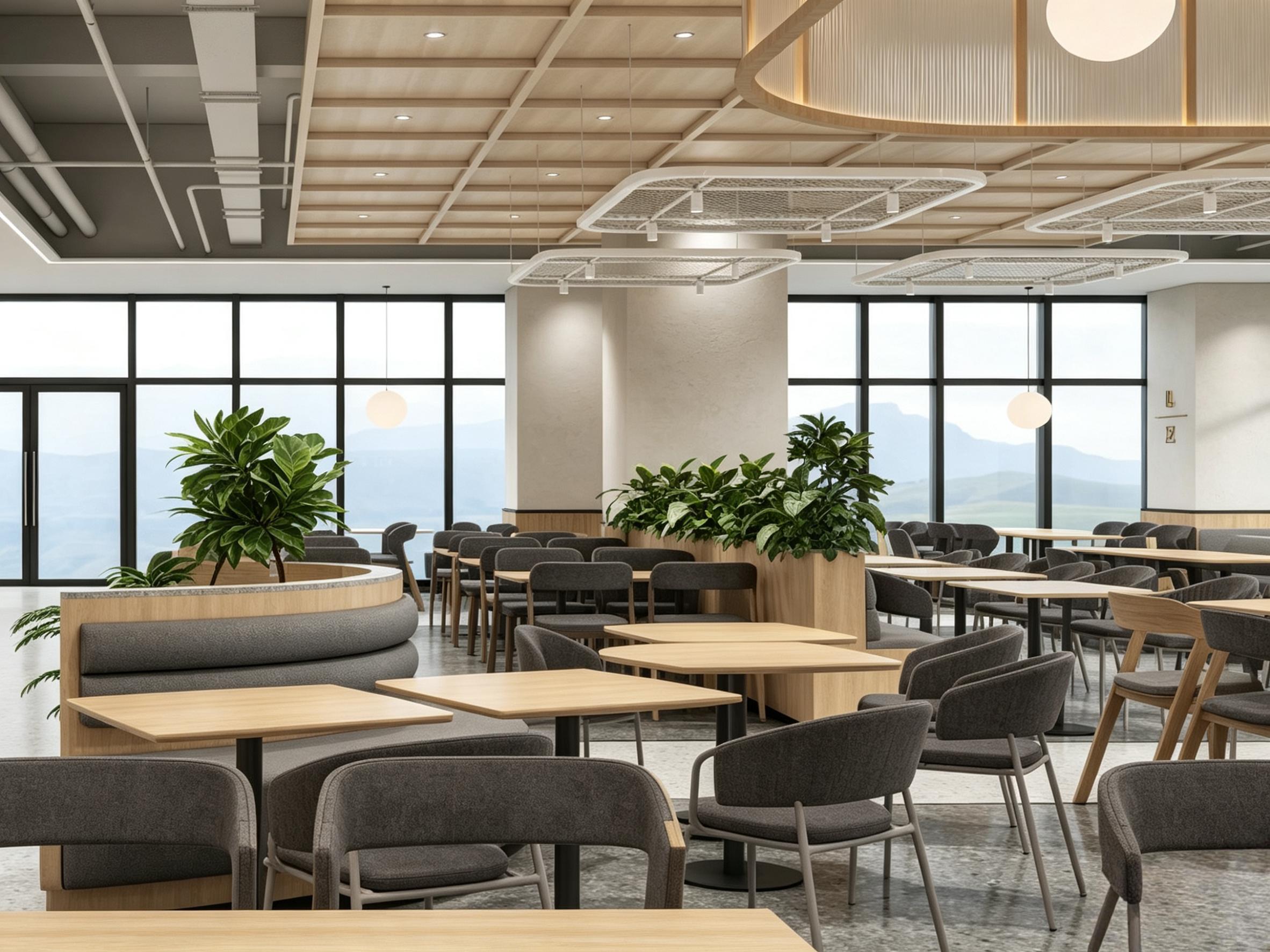 空间兼顾日常员工快餐就餐、团队休闲交流、商务接待聚餐等多元场景,以柔和干净的空间氛围,提升用餐舒适度与企业环境质感。