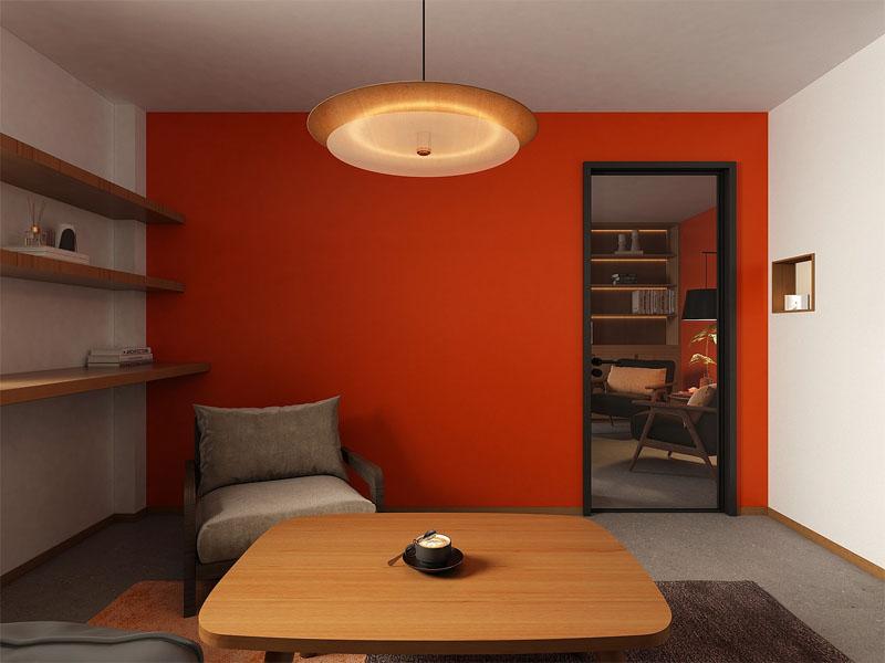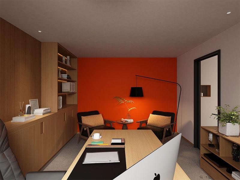 | 案例简介 | 四川壹西格玛建筑工程有限公司为成都某办公空间打造了一套兼具高效与温度的现代办公装修方案,以温润木色为基底,搭配低饱和墙面与点睛的橙红色,打破传统办公空间的冰冷感,构建了开放协作与独立办公兼具的舒适办公场景。 |