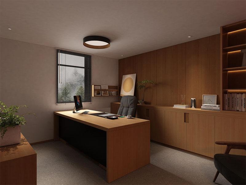 设计中兼顾了功能与动线的高效性:独立办公区以大尺寸原木办公桌为核心,搭配通透的玻璃隔断与百叶窗,保证了充足的自然采光,同时通过嵌入式收纳柜整合了文件与杂物,让办公场景保持整洁有序;休闲洽谈区则以舒适的布艺座椅与原木茶几为载体,搭配柔和的吊灯与落地灯,打造了放松的交流场景,让团队沟通摆脱刻板的会议室限制。