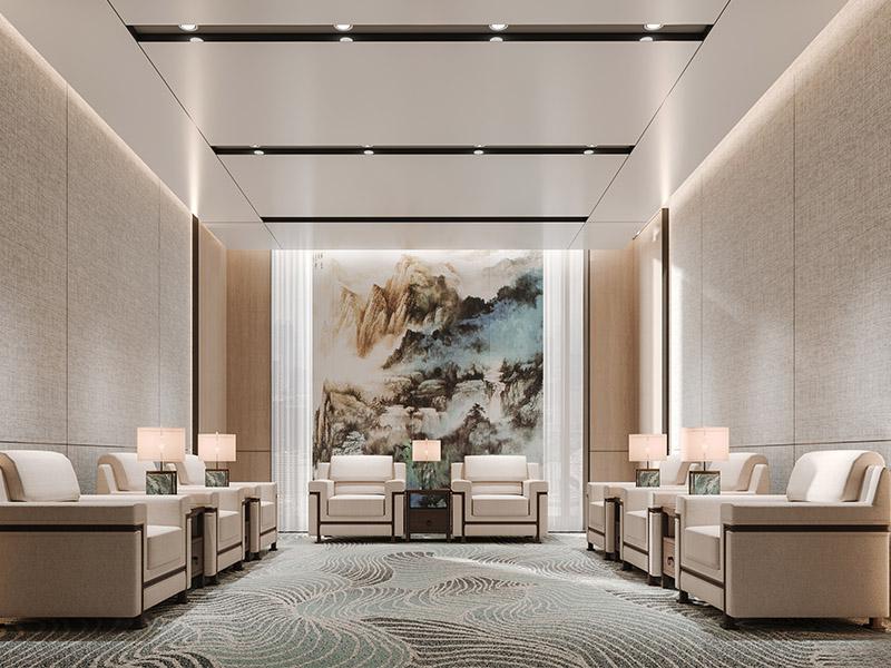 功能分区上,我们拒绝刻板布局,为不同场景定制专属表达:私宴厅以水波纹吊顶与东方山水壁画,打造兼具私密性与格调的商务宴请场景;贵宾接待室用对称式布局与柔和无主灯,传递庄重专业的接待气场;总裁办公室兼顾现代高效与东方沉稳,满足企业决策者的办公与会客双重需求;大型会议室则以流线型设计与通透采光,打破沉闷感,为团队协作赋能。