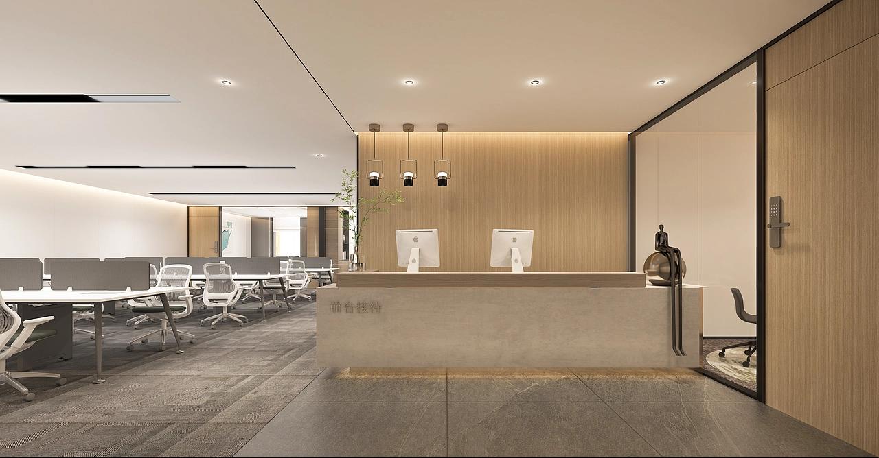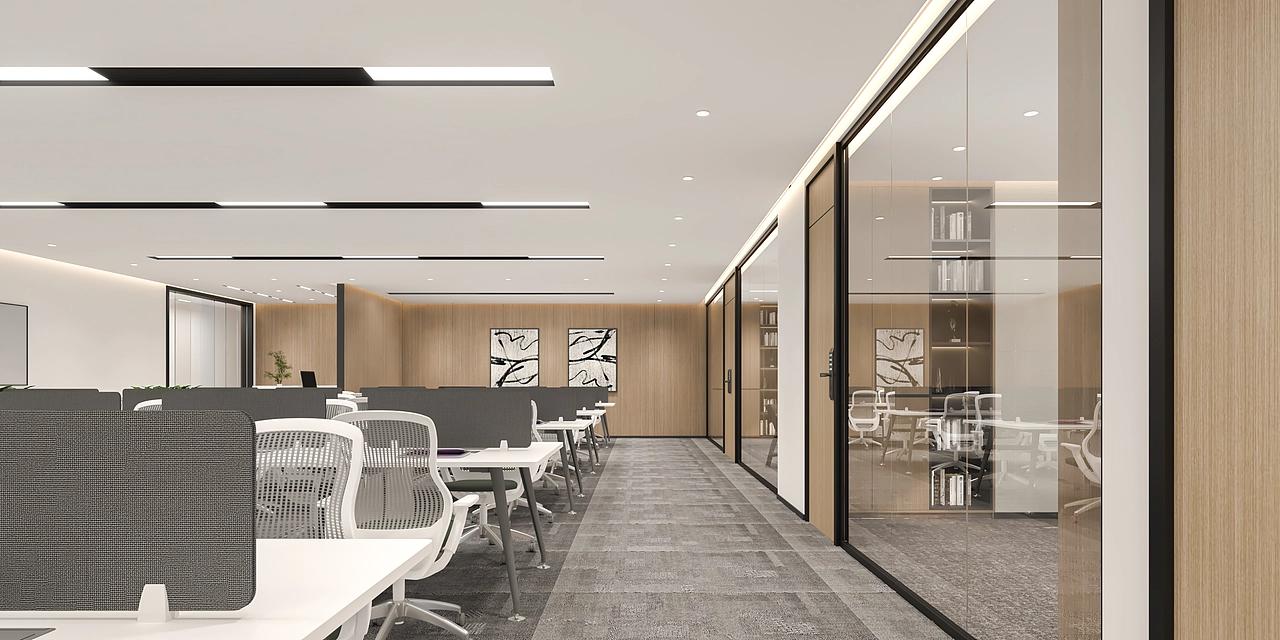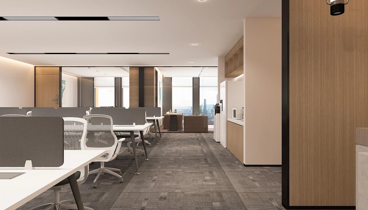 材质与色彩选用上,贴合科技企业理性、简约的特质,以浅灰、米白、深灰为基底色调,搭配浅木色与金属线条点缀,整体低饱和配色既显高级统一,又弱化办公空间的冷硬感。核心材质以玻璃、金属、木饰面与耐磨地砖为主,玻璃隔断选用超白玻与磨砂玻璃,强化通透感与科技质感;金属材质用于灯具、家具框架与收边,增添现代精致感;浅木饰面应用于墙面、柜体与工位,自然温润的肌理中和工业风的硬朗,同时具备耐磨易清洁的工装属性,适配办公高频使用场景;地面采用商用方块地毯与灰色地砖,兼具降噪、防滑、耐用的优势,满足公装空间的实用需求。