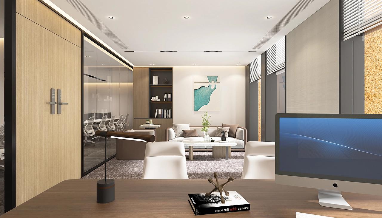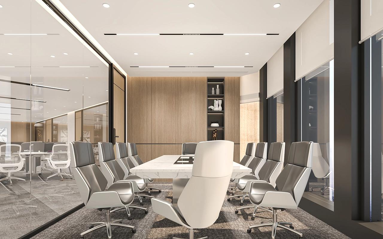 功能分区上,兼顾多元办公场景需求,用窄边框玻璃隔断划分独立办公室、会议室、洽谈区与休闲区,既保证各区域独立性与私密性,又不阻断光线流通,让整个空间通透明亮。独立办公室多为管理层与核心部门使用,以深木色饰面搭配金属线条,营造沉稳大气的氛围,满足私密办公与VIP接待需求;会议室配备高清会议设备与可调节卷帘,大会议室以长桌与皮质座椅凸显正式感,中小会议室采用灵活布局,适配日常研讨、商务谈判、技术涉密会议等不同场景。茶水休闲区设置在办公区边缘,远离核心工位,配备冰箱、咖啡机等设施,搭配舒适沙发与绿植,成为员工放松小憩、缓解压力的空间,提升团队归属感。
