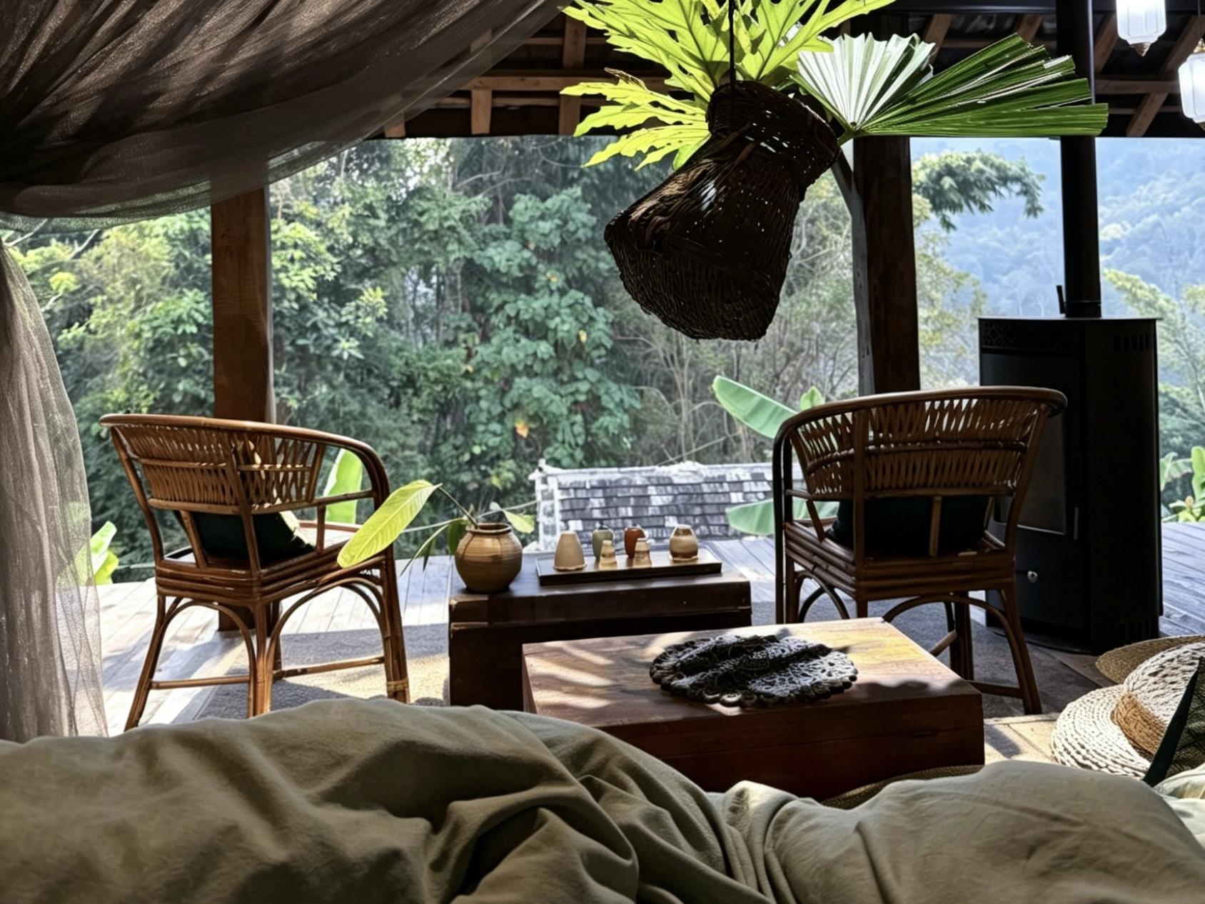 依山而筑的木屋,被万顷绿意温柔环抱。露台藤椅、粗陶器皿、悬空藤编花艺,随风轻扬的朦胧纱幔,卧于榻上便可揽尽层叠山林。山风穿林,光影漫过原木肌理,所有疲惫与浮躁,都在此刻被自然温柔消解。