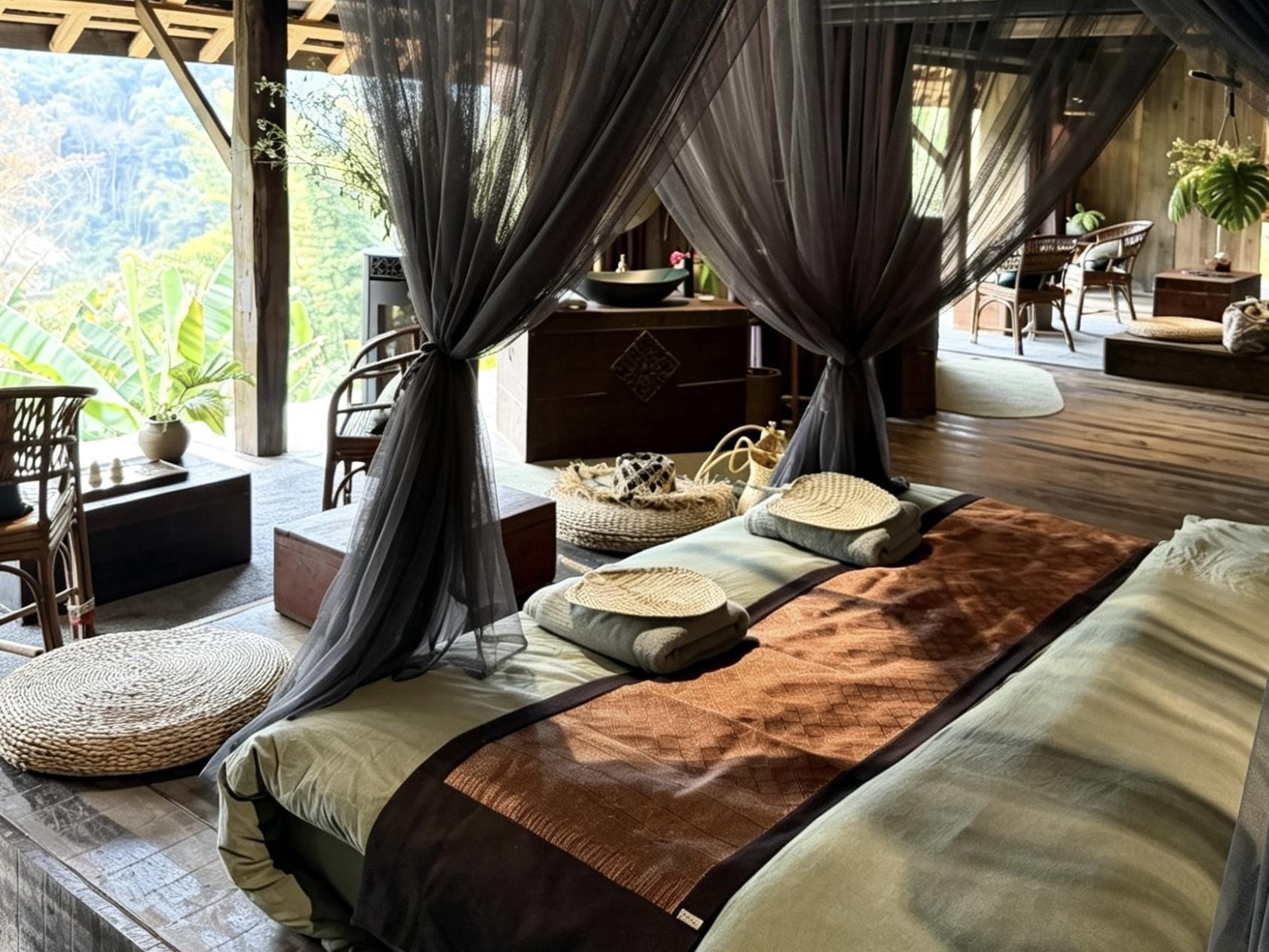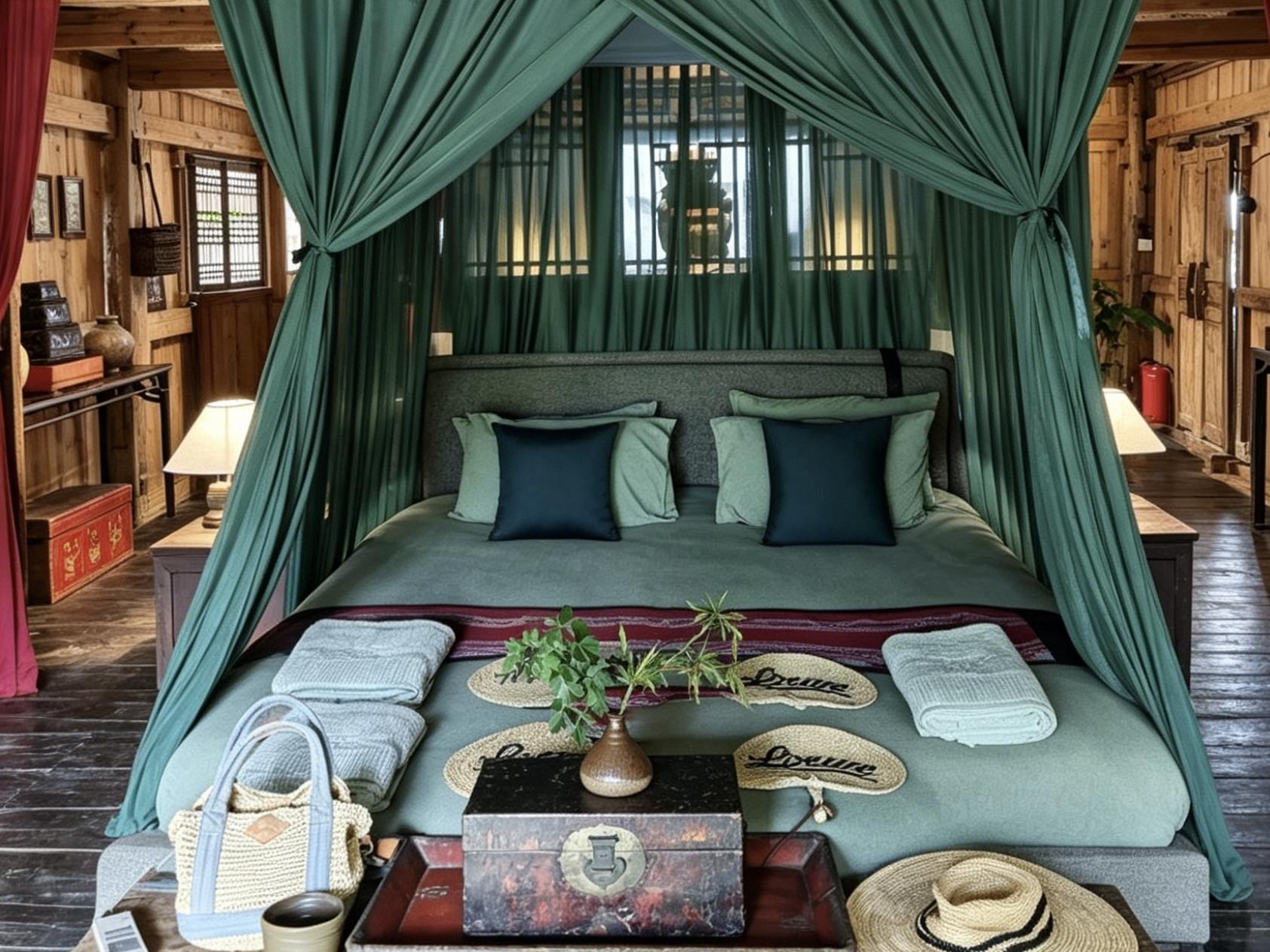 步入室内,满室皆是原生质感。老木梁柱、温润木地板,搭配垂坠墨绿色帷幔、棉麻床品、复古旧物与手工藤编器物,以草木、粗陶、天然材质勾勒东方禅意。没有繁杂冗余的装饰,只用最质朴的设计,还原旅居本该有的松弛感。另有素净雅致的卧房,白纱围床,浅调软装干净通透,野枝入瓶,一室清宁。