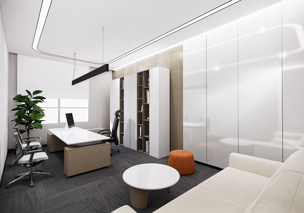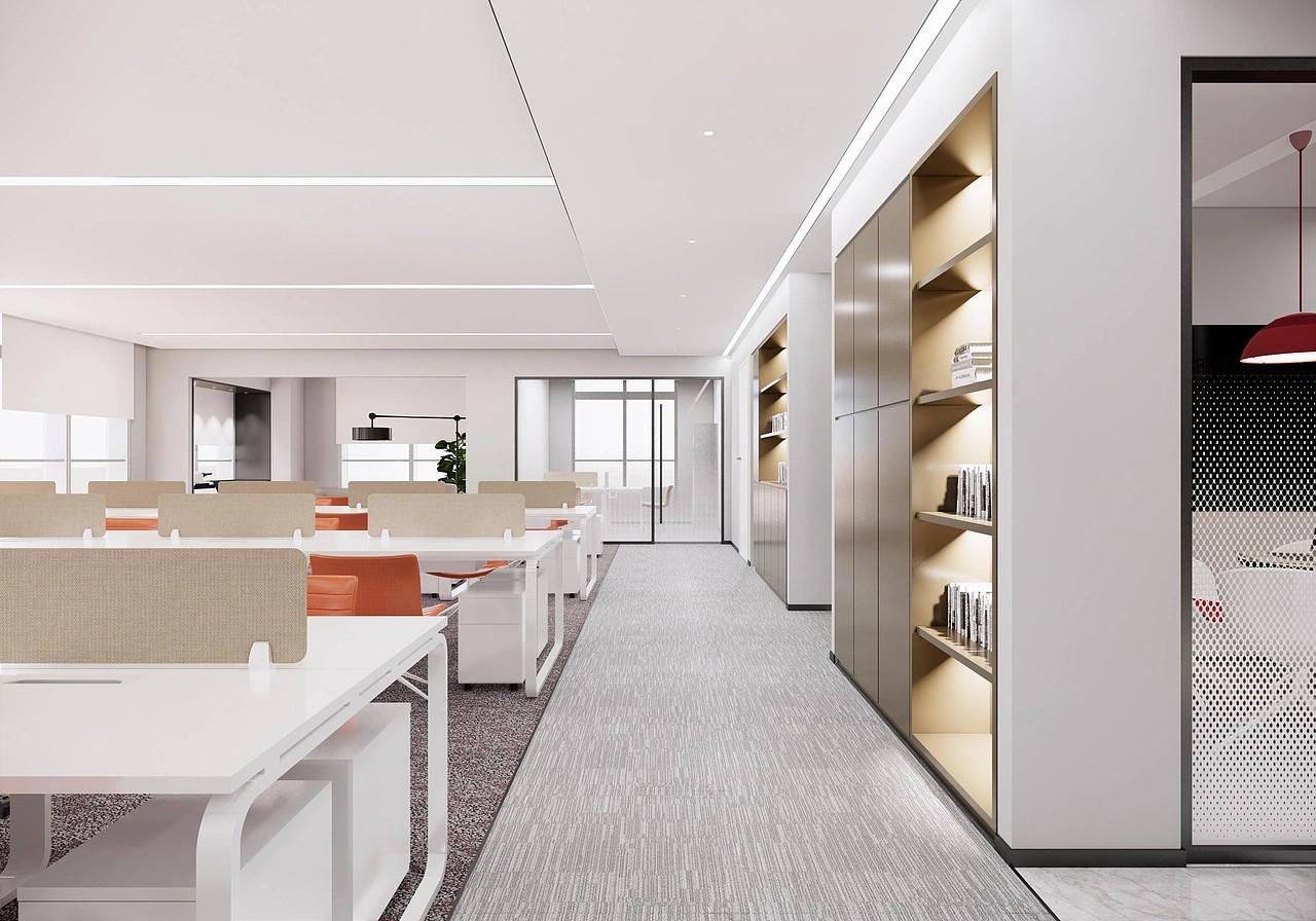 顶面大面积采用当下办公空间热门的无主灯设计,嵌入线性灯带与防眩筒灯组合,光线均匀柔和,全程无刺眼眩光,在视觉上拉高整体层高,营造整洁高级的极简视觉效果,同时充分契合办公空间长时间用眼的健康采光需求,长时间办公也不易产生视觉疲惫。地面采用差异化材质铺贴设计,前厅入户、公共过道选用亮面浅纹大理石地砖,提升入户第一印象的气场与洁净精致感;办公区、洽谈区、会议区则铺设深浅灰色系静音地毯,能够有效降噪防滑,提升行走舒适度,大幅弱化办公区域噪音干扰,打造安静专注的办公环境。