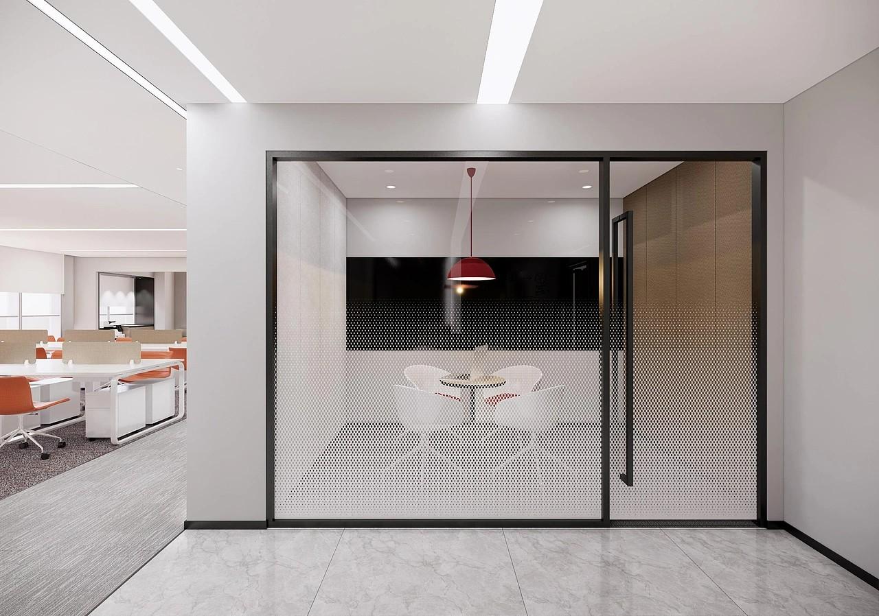 立面设计之上,大面积运用哑光白色定制柜体、温润木纹饰面墙板与极简玻璃隔断,特色半通透打孔玻璃隔断,既高效实现了空间分隔,又不会阻挡自然光的穿透流转,让整个办公公区采光拉满、视野开阔,视觉上无限延伸空间尺度,彻底消除大面积办公空间的压抑局促感。全屋贯穿一体化定制收纳系统,通顶嵌入式柜体兼具展示与储物双重功能,封闭柜体隐藏杂物保持空间整洁,开放格错落摆放书籍与软装绿植,大幅提升空间利用率与整体规整度,实现极简美学下的极致收纳。