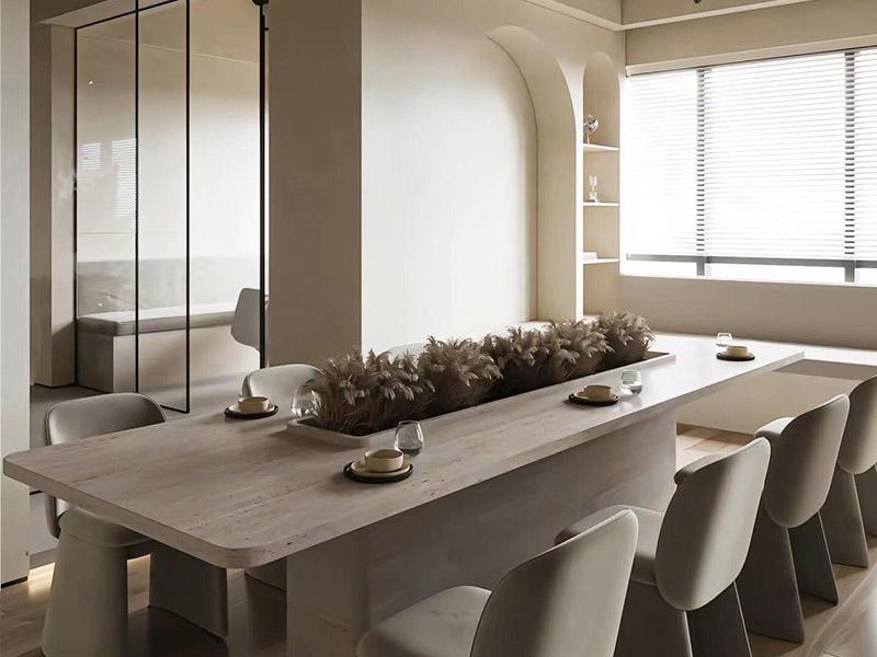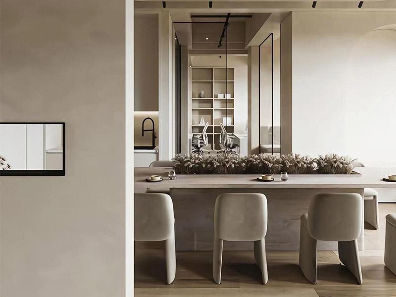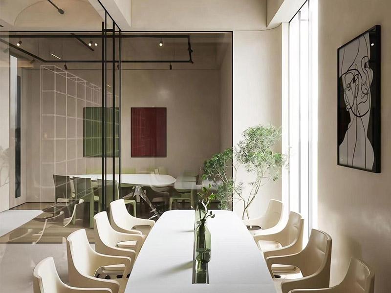 壹西格玛的办公室设计,从不局限于单一风格的复刻,而是从企业的使用需求出发,将收纳、办公、社交、会议等功能自然融合。从前厅的通高收纳柜与洞洞板设计,到茶歇区的洞石长桌与圆弧餐椅,再到走廊的黑框玻璃隔断,每一处细节都兼顾实用性与美学表达。我们擅长用微水泥、木材、玻璃等温润材质,搭配米白、浅杏等低饱和色调,再通过拱形吊顶、暗藏灯带、嵌入式壁灯等设计,柔化空间棱角,让自然光与人工光交织出舒适柔和的光环境,消解传统办公的压抑感。