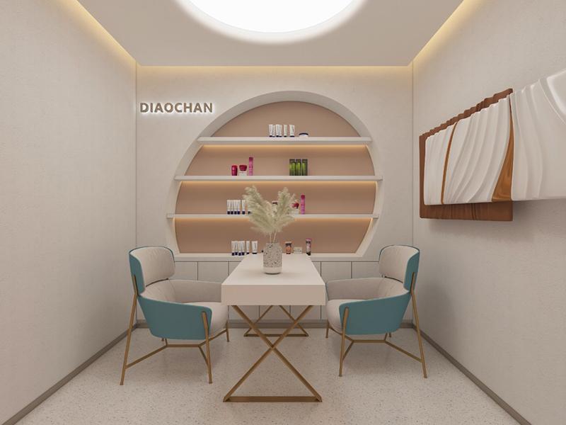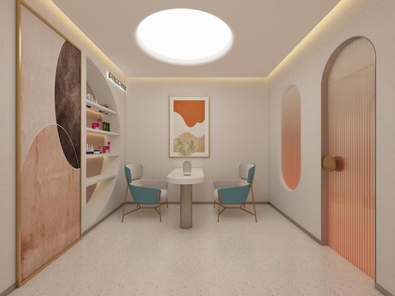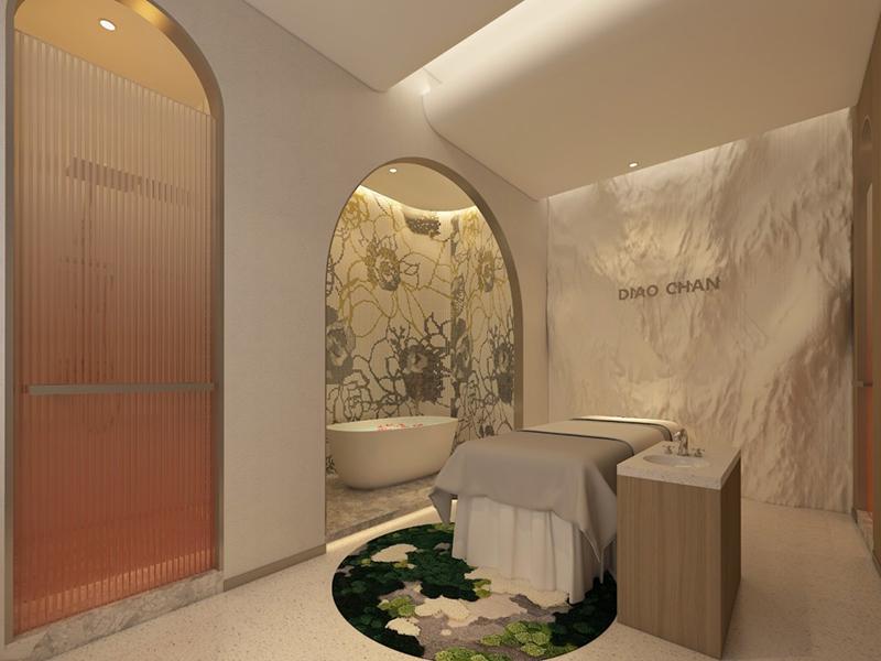 护理区是本次设计的核心所在。单人间护理室中,我们以定制圆形绿植地毯呼应墙面的大理石纹理,将自然生机巧妙引入室内;双人与泡浴一体化房间,则通过拱形门洞清晰界定出独立泡浴区,墙面的花卉马赛克瓷砖与花瓣浴缸相映成趣,搭配无眩光的漫射光源,让顾客在护理过程中彻底沉浸于疗愈氛围。咨询室采用低饱和配色与弧形置物架设计,既满足产品展示的实用需求,又以柔和曲线传递出专业且亲切的品牌气质。