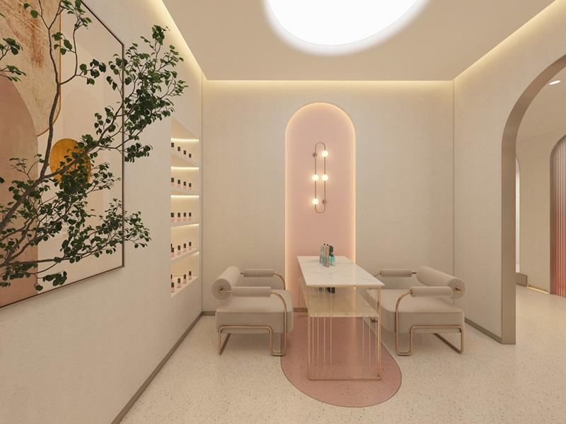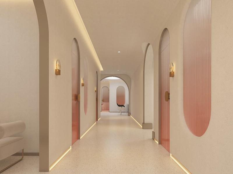 动线规划上,我们秉持“循序渐进的松弛感”原则,从公共接待区到私密护理室,通过连续的拱形门洞、渐变的光影层次与软质隔断,自然完成从“喧嚣”到“静谧”的情绪过渡。走廊的线性灯带如潺潺溪流般引导行进路径,搭配柔雾质感的长虹玻璃门,既充分保障了空间的私密性,又借助光影变化,营造出移步换景的高级仪式感。