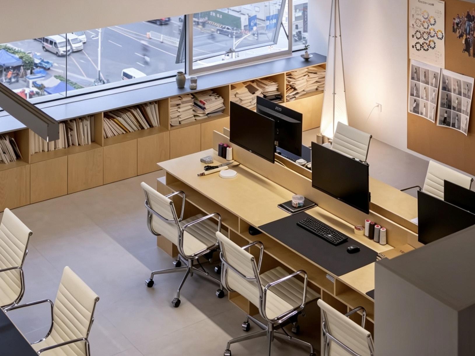 全景采光大窗贯穿空间,自然天光毫无保留涌入室内,彻底驱散传统办公室封闭压抑的沉闷感。靠窗整排定制原木柜体,开放格规整收纳书刊资料,兼顾强大收纳力与空间通透感。模块化定制工位排布有序,动线舒展流畅,利落整洁的桌面布局,完美适配日常办公办公需求。