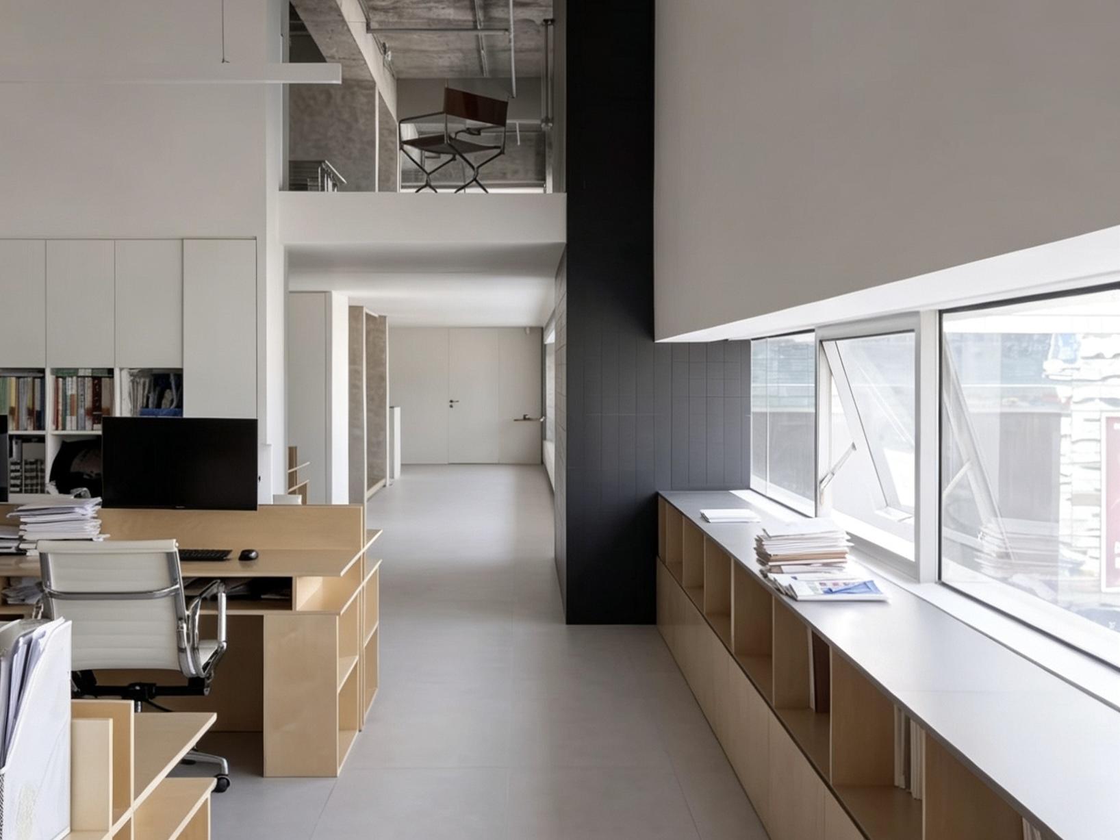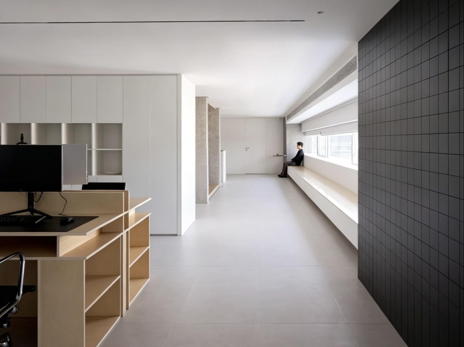 空间深谙留白设计美学,通铺哑光浅灰地砖拓宽视觉尺度,墙面用材质肌理划分层次,深色小砖立面、暖棕木饰面温柔点缀空间。温润原木肌理弱化职场紧绷感,利落极简线条消解空间压迫感,窗外街景与室内光影相互交织,让日常办公都裹挟着松弛氛围感。
