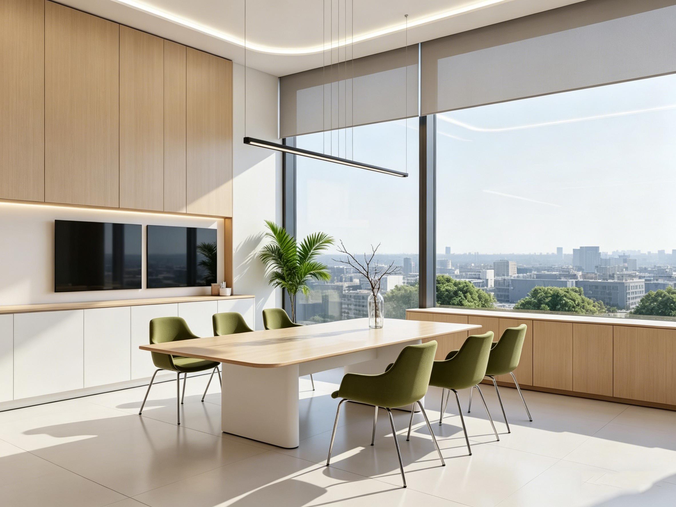 独立办公室延续了整体原木风格,定制的整墙收纳柜兼顾了展示与储物功能,内嵌灯带的设计让展示区更具质感;大型会议空间采用无主灯设计,搭配极简长桌与软质座椅,打造出舒适高效的沟通场景,背景墙的双屏设计也满足了现代化会议的需求。此外,空间中点缀的大型绿植与落地盆栽,进一步拉近了办公环境与自然的距离,柔化了硬朗的办公线条。