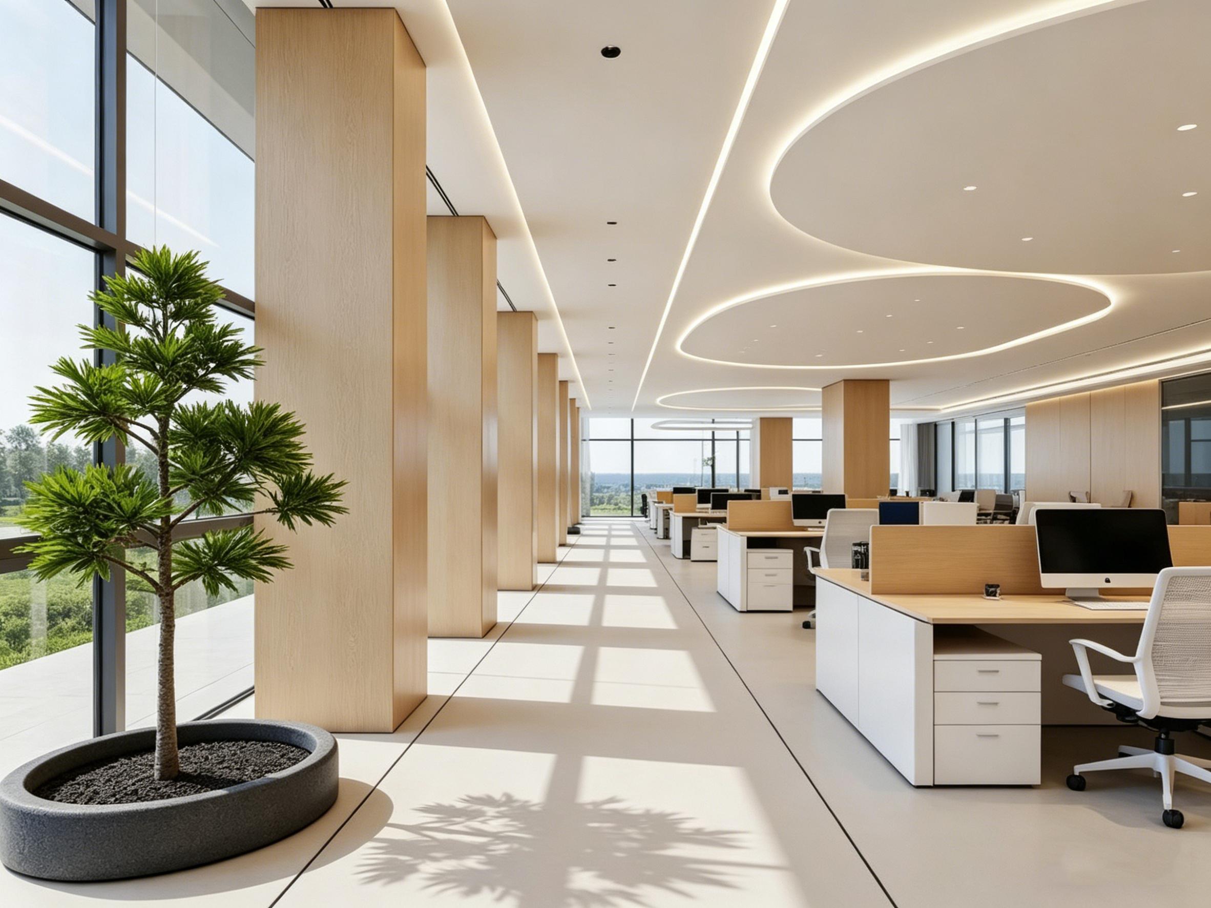 本案以温润的浅原木色作为空间主调,搭配纯净的白色基底,弱化了传统办公空间的冰冷感,注入了自然柔和的温度。开放式办公区采用模块化工位布局,通过半高隔断实现了空间的有序划分,既保障了员工的专注度,也维持了空间的通透感;走廊区域利用大面积落地窗引入充足自然光,搭配线性灯带与圆形吊顶的设计,勾勒出流畅的空间动线,光影交错间,让空间层次更显灵动。