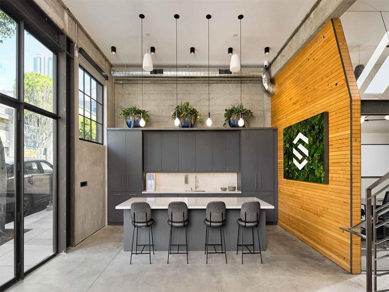 公共区域的设计更见用心。开放式吧台采用深灰柜体搭配白色台面,上方悬挂的球形吊灯为空间注入柔和光线,墙面的苔藓绿植墙不仅是品牌展示的载体,更是天然的“空气净化器”。壹西格玛在公装装修中始终认为,办公空间不该只是工作的容器,更该是品牌文化与员工情绪的载体。这处空间里,裸露的混凝土与温润的木材共生,硬朗的金属线条与柔软的布艺家具交融,每一处细节都在诉说着“高效不压抑,专业不刻板”的设计主张。