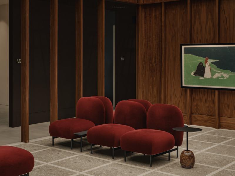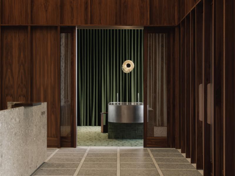 项目以胡桃木饰面为基底,构建起贯穿全空间的温润肌理。天花的方格木构吊顶自带漫射柔光效果,搭配通高木饰面墙面,既强化了空间的秩序感,也让踏入这里的瞬间便感受到松弛的氛围。水磨石前台与地面形成呼应,不锈钢金属构件与橄榄绿丝绒窗帘、酒红色绒面座椅形成冷暖对比,打破了医疗空间的刻板印象,营造出堪比高端酒店的舒适体验。
