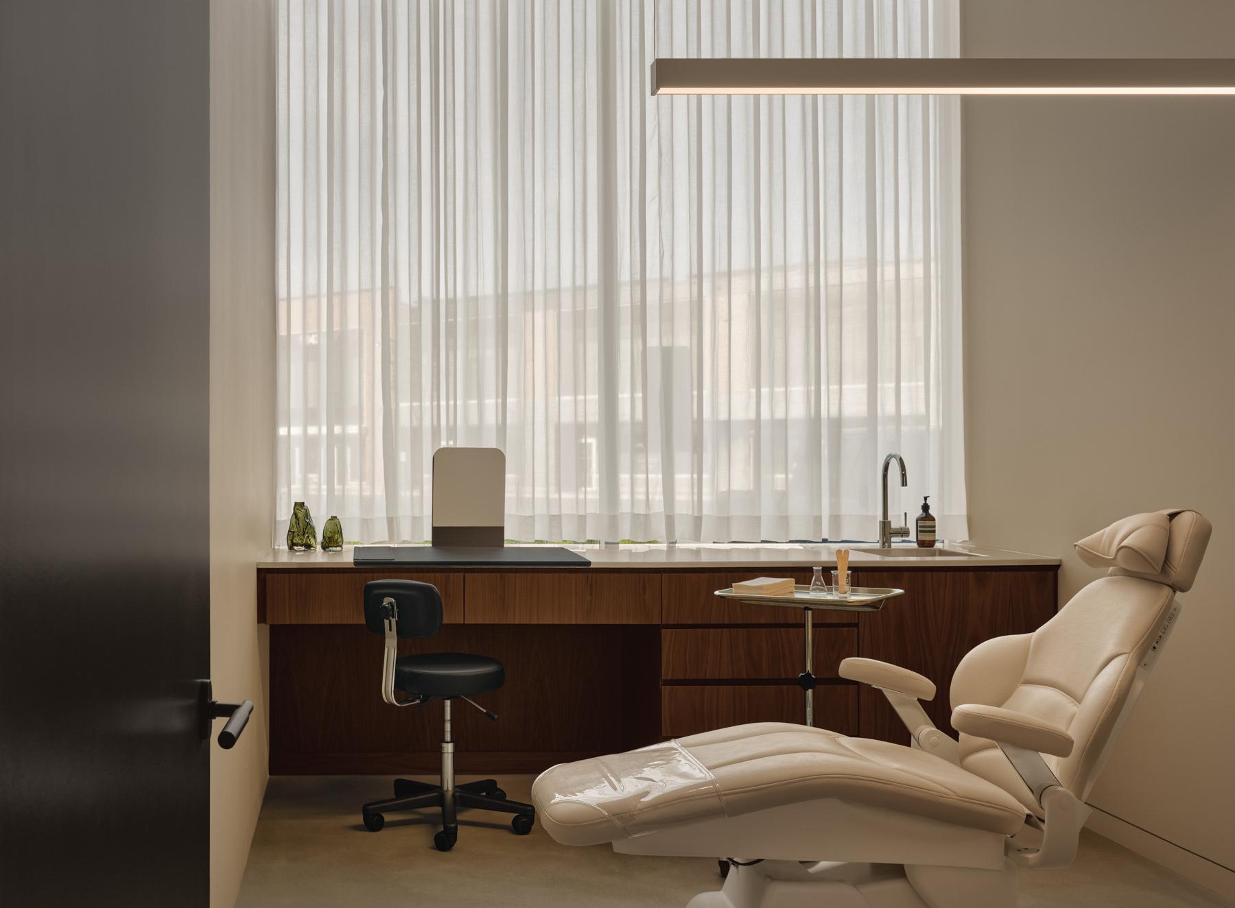 动线设计上,从公共接待区到私密诊疗室,空间层层递进,流畅自然。入口处的序列感木构吊顶引导访客动线,等候区以柔软的布艺座椅与艺术陈设消解就医焦虑,不锈钢操作台与金属墙面则以克制的工业感呼应医疗功能,而诊疗室里的半透纱帘与线性照明,在保证专业性的同时,也守护了患者的私密性。穿孔金属木门、几何拼花瓷砖等细节,更在简约的设计语言中,兼顾了实用性与高级感。
