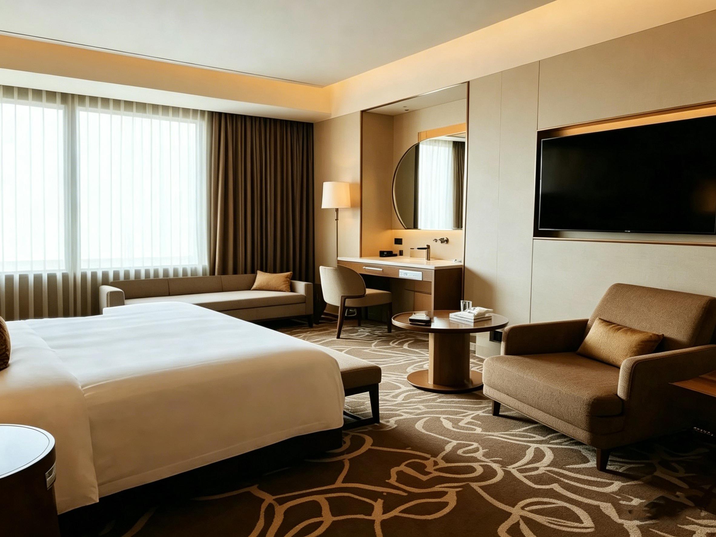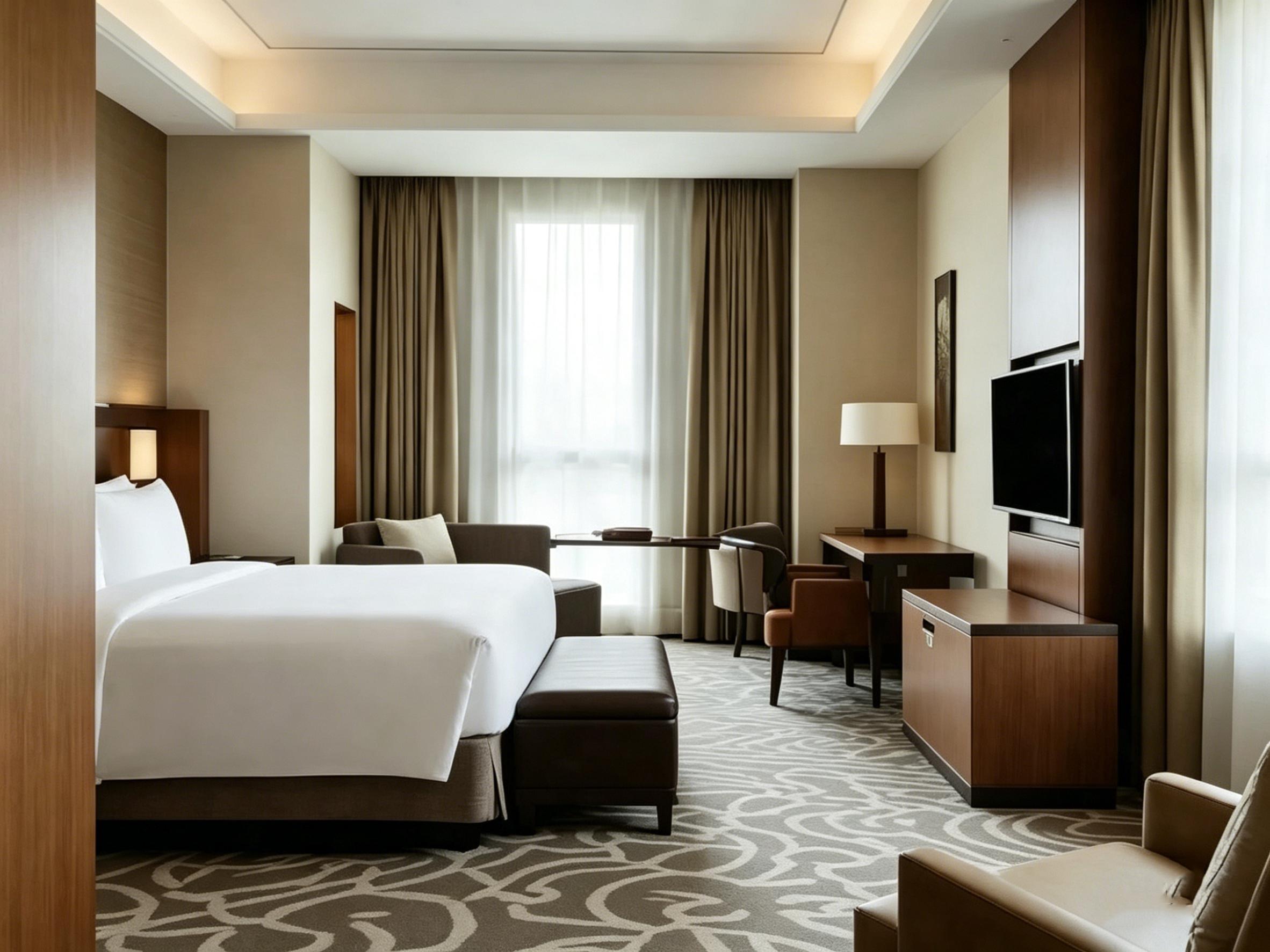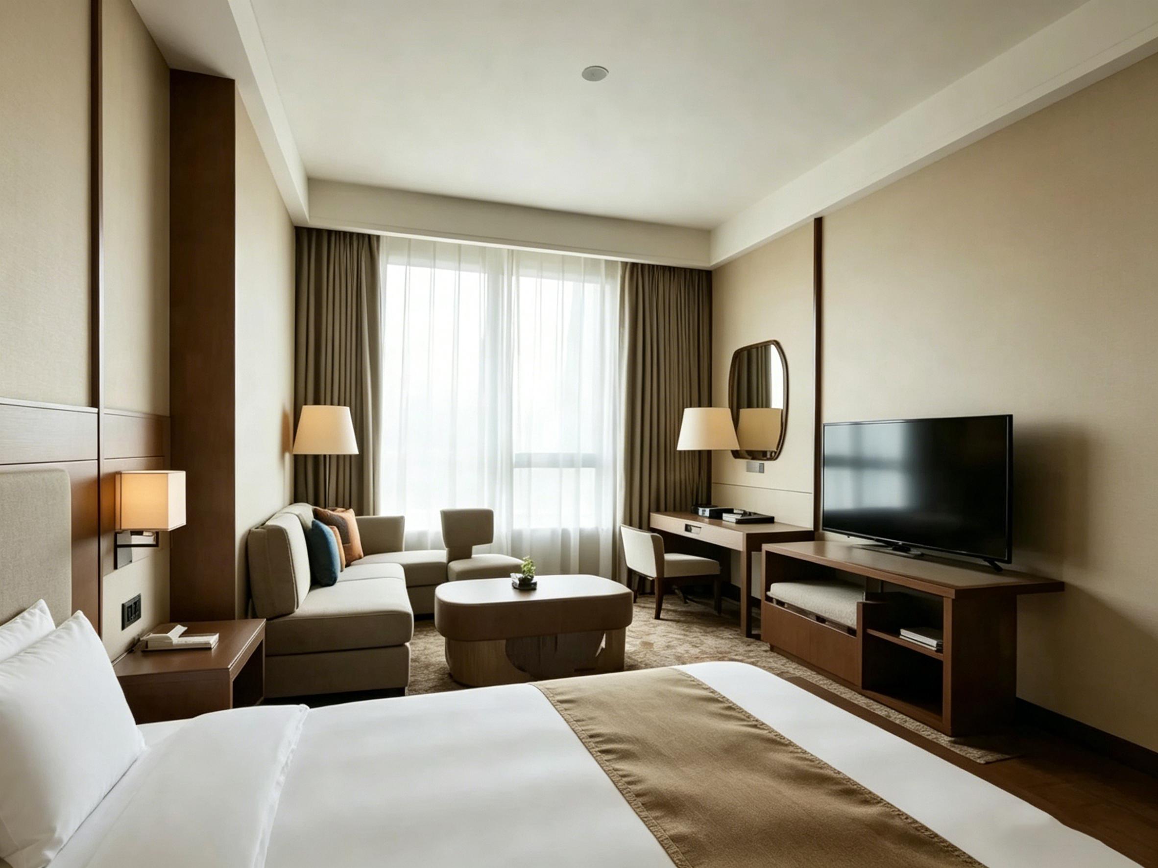 空间设计上,项目融合现代简约轻奢与新中式东方美学两大风格,以温润原木质感、低饱和暖调基底为空间主基调,搭配沉稳深木色柜体、柔和暖光灯带与层次分明的顶面吊顶,营造出大气沉稳、安静治愈的空间氛围。客房内部严格划分睡眠休憩、休闲会客、办公梳妆、卫浴私密四大功能区域,动线流畅合理,既保证居住私密性,又最大化利用室内面积,实现舒适度与实用性的平衡统一。