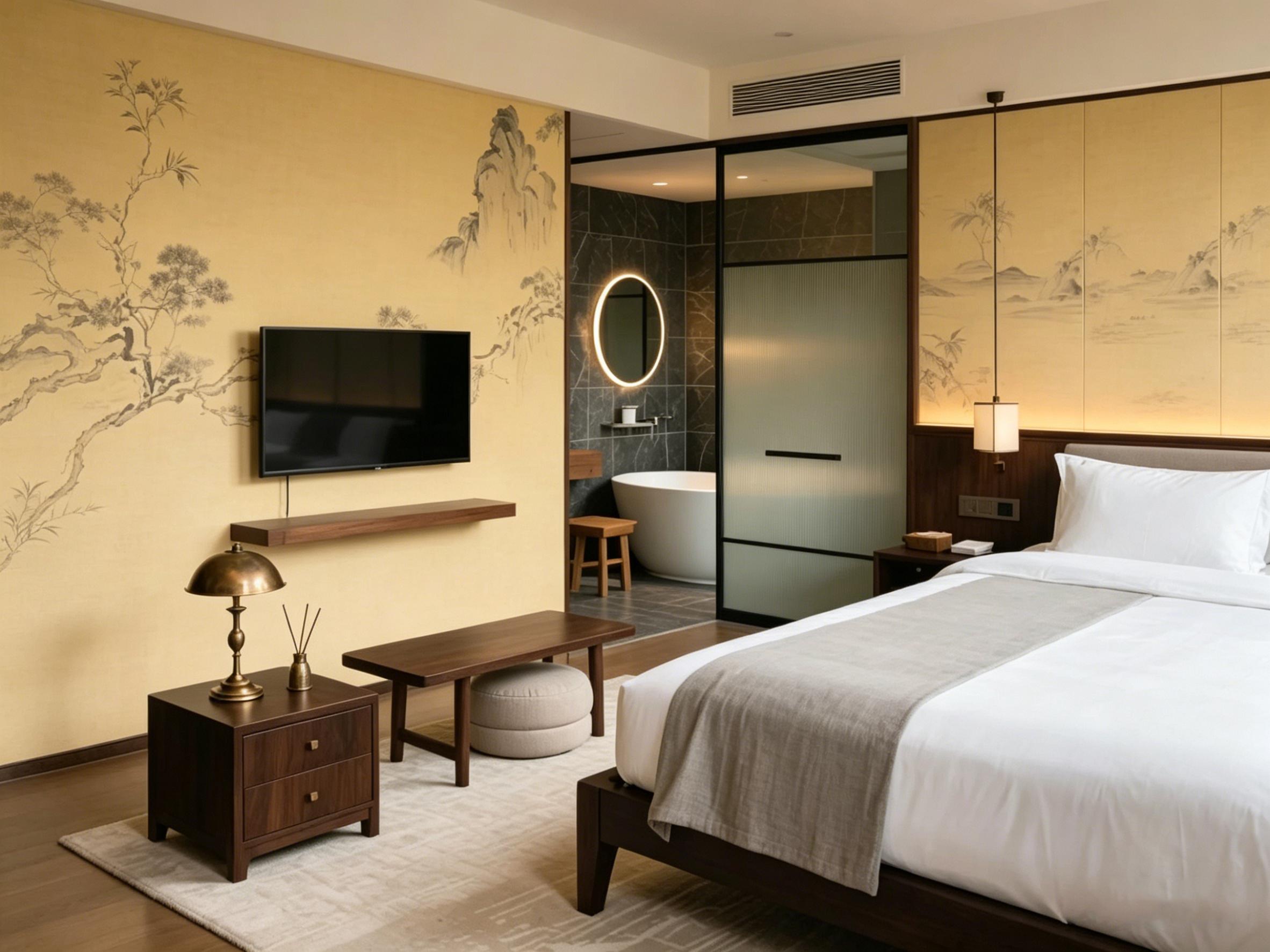 在细节工艺与软装落地层面,四川壹西格玛建筑工程有限公司严格把控施工标准,墙面采用硬包木饰面包边工艺,隔音防潮耐用;地面搭配定制艺术地毯与实木地板,脚感舒适同时提升空间高级感;窗帘采用双层遮光纱帘组合,卫浴区使用长虹玻璃隔断干湿分离,兼顾隐私性与采光通透度。床头背景、水墨艺术墙面、定制实木家具、氛围灯具等软装全部一对一量身定制,弱化商业空间的冰冷感,注入东方雅致的温润诗意,让每一间客房都兼具高端酒店的品质格调与居家般的温暖松弛感。