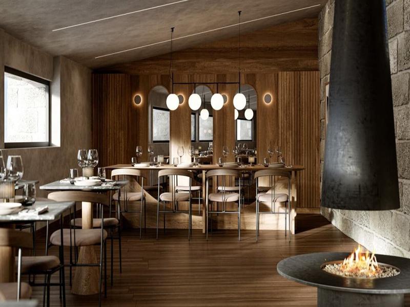 餐饮用餐社交区整合餐吧卡座、正餐餐桌、壁炉休闲角落多功能场景,天然石材吧台、原木餐桌、艺术吊灯与开放式壁炉相互呼应,既可以提供民宿餐饮配套服务,也能作为住客社交聚会、围炉放松的专属空间。材质风格与整体自然温润风格高度统一,同时优化后厨动线与用餐舒适度,兼顾美观性与日常运营便捷性。