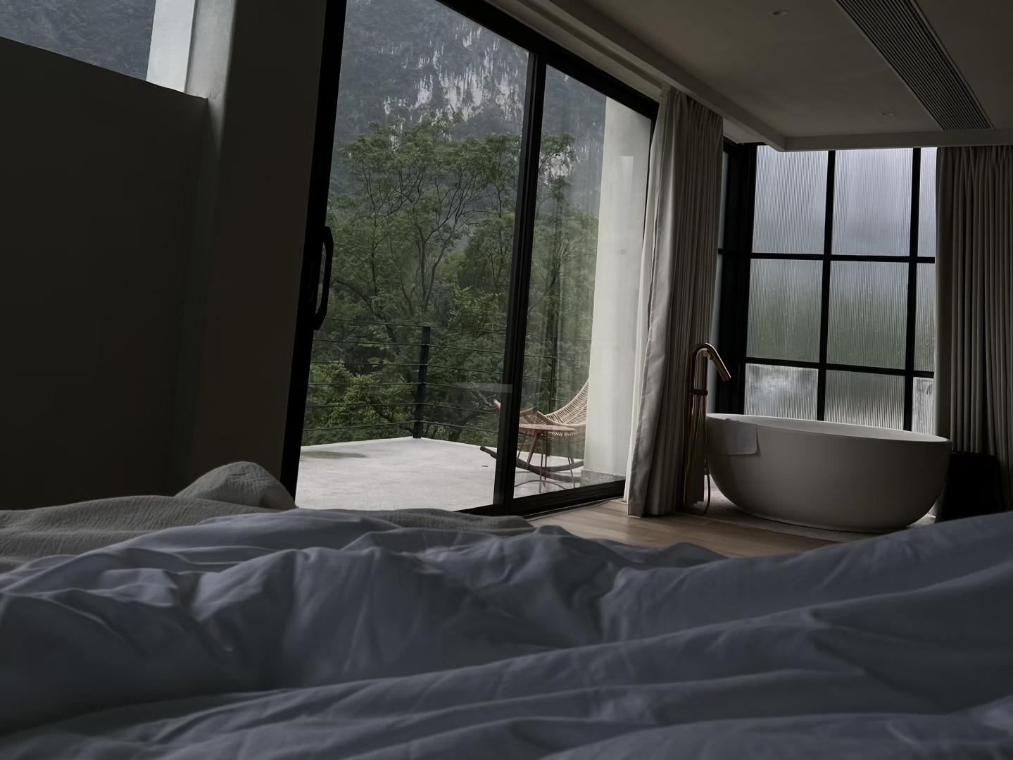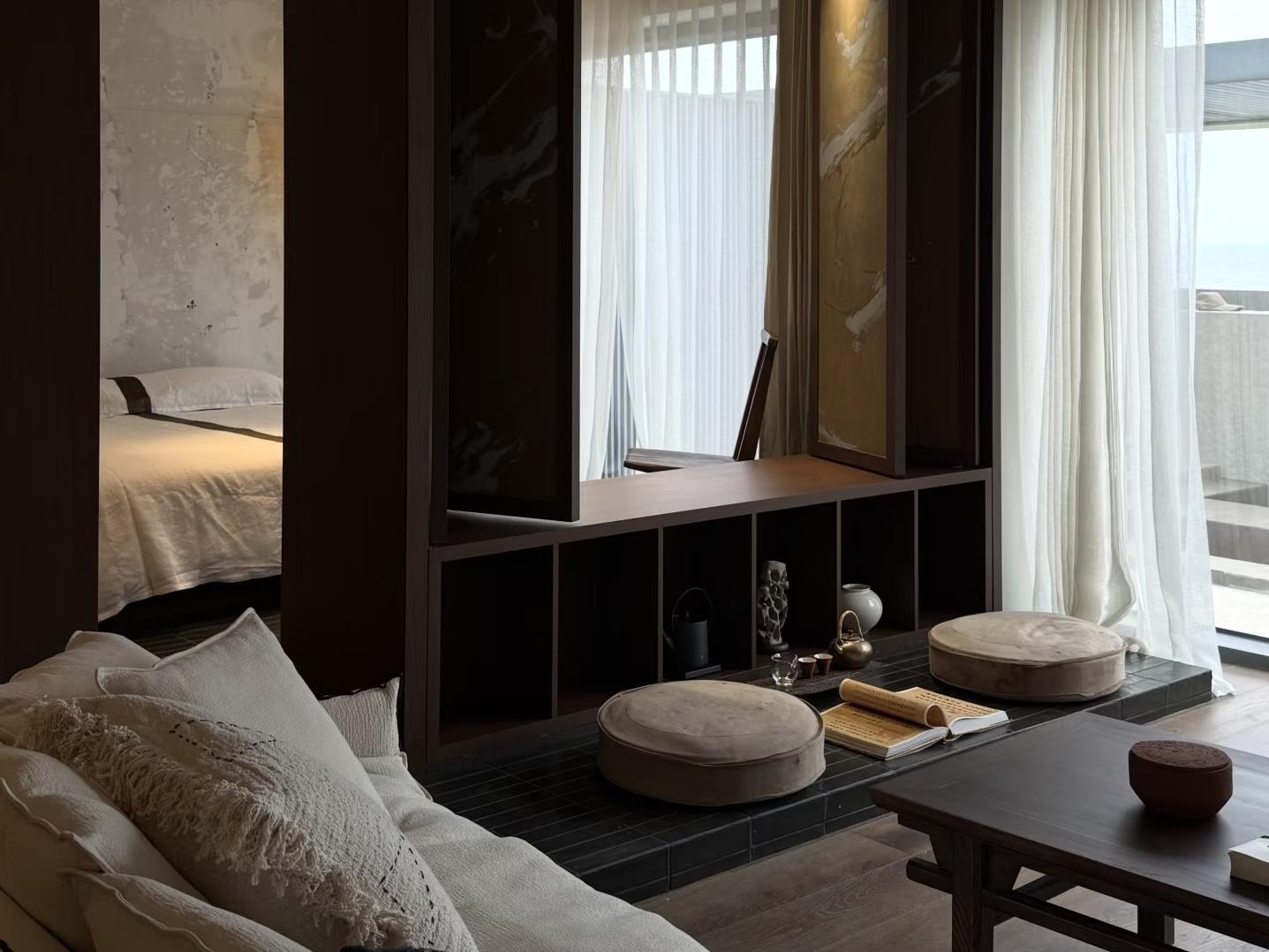空间将自然光影与室内氛围完美融合。暖调球形纸艺落地灯漫开温柔光晕,柔软床品自带慵懒褶皱,每一件软装都摒弃繁复造型,以简约质朴还原生活本真。室内木质隔栅、开放式收纳柜体巧妙划分空间层次,禅意茶区、休闲静坐区错落排布,古朴茶器、闲逸书卷散落角落,一器一物皆藏闲适意境。全景落地窗彻底打破室内外界限,将山间绿意、辽阔湖山尽数框入室内,卧于床榻便可揽尽山河风光,晨起暮落,朝夕皆与自然相拥。