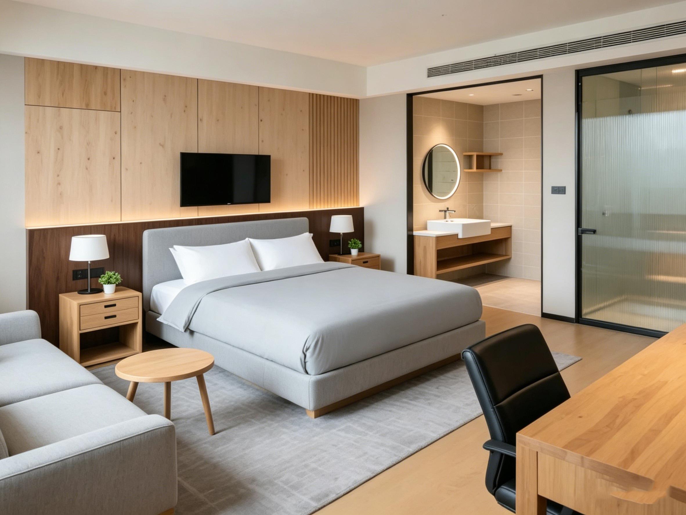本案由成都壹西格玛全案设计落地,作为深耕本土的成都装修设计公司,我们从海量成都酒店装修效果图的实操经验里萃取东方美学精髓,打造出这套极致纯粹的侘寂禅意旅居空间。整体空间主动褪去所有多余修饰,以斑驳粗粝的艺术微水泥墙面为空间基底,完整保留墙面自然斑驳的原生肌理,自带岁月沉淀的质朴氛围感。搭配深棕沉稳木作、温润原木家具与柔软亲肤的棉麻织物,低饱和色系相互交融平衡,无浓烈跳脱的色彩,仅在材质肌理的碰撞里,藏满东方留白的禅意美学。