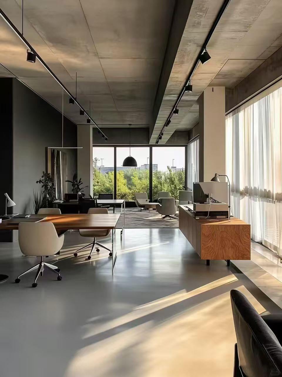 空间以清水混凝土为骨架,裸露的天花板与承重柱保留着原始肌理,搭配温润的原木家具与浅灰色环氧地坪,冷硬的工业质感被自然的暖意中和。整面落地玻璃引入充沛自然光,日光在空间里流淌,将光影切割成流动的线条,既消解了大面积办公空间的沉闷感,也让开放工位、会议区与休闲区的动线更显通透。