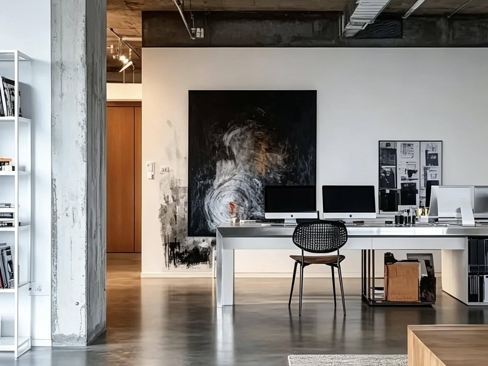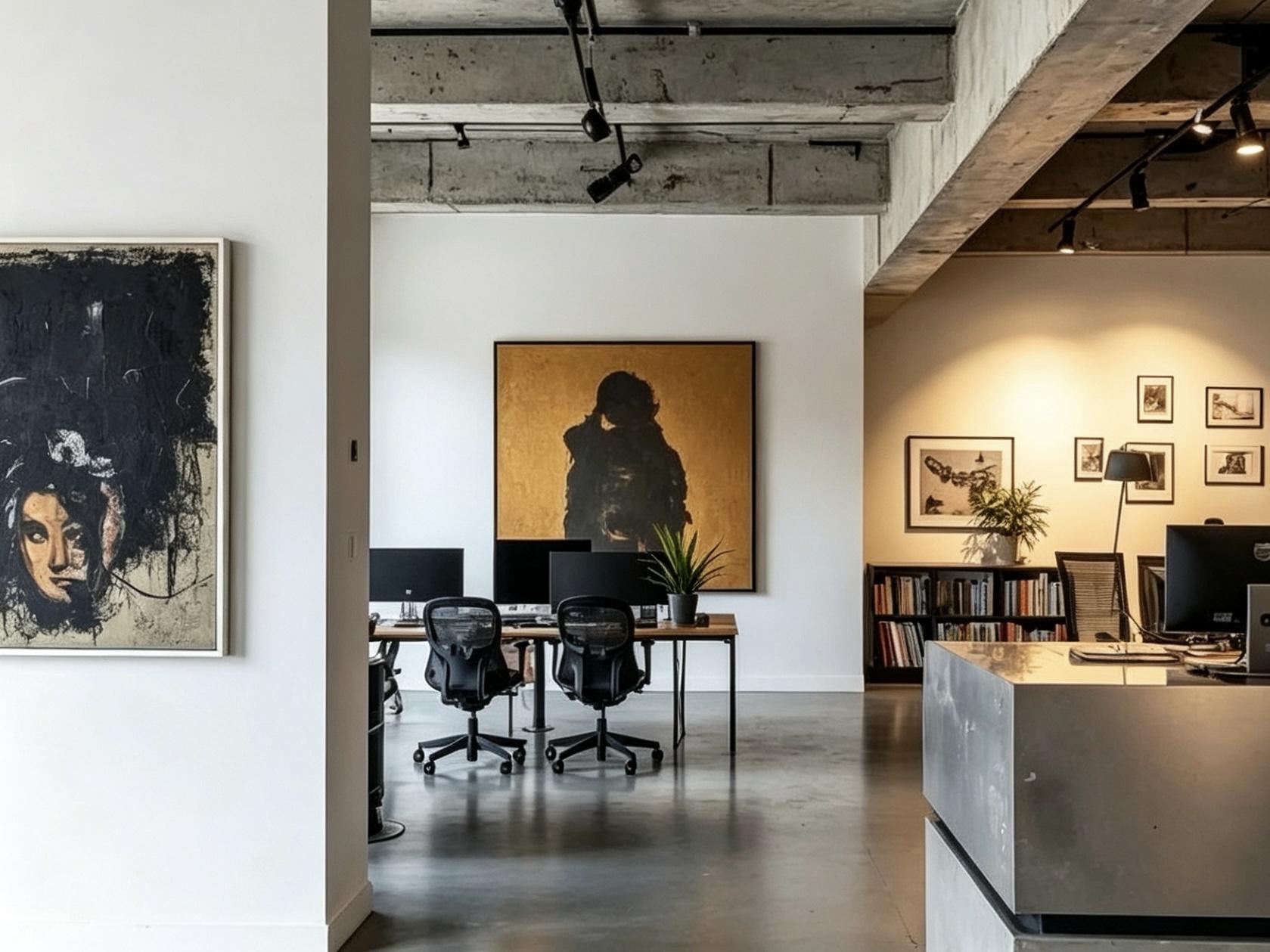 整体空间摒弃多余装饰,裸露混凝土梁柱、镜面通透隔断、无缝水泥自流平地面,自带清冷利落的空间肌理。纯白墙面与深棕艺术挂画形成视觉平衡,大面积留白弱化办公的压抑感,原木家具、简约办公家具与随性绿植穿插其间,让硬朗的工业质感多了温润烟火气。开阔无压抑的动线规划,兼顾开放式团队办公、独立静谧办公区,采光通透、分区合理,无论是初创工作室,还是整层办公大楼改造,都能完美适配空间需求。