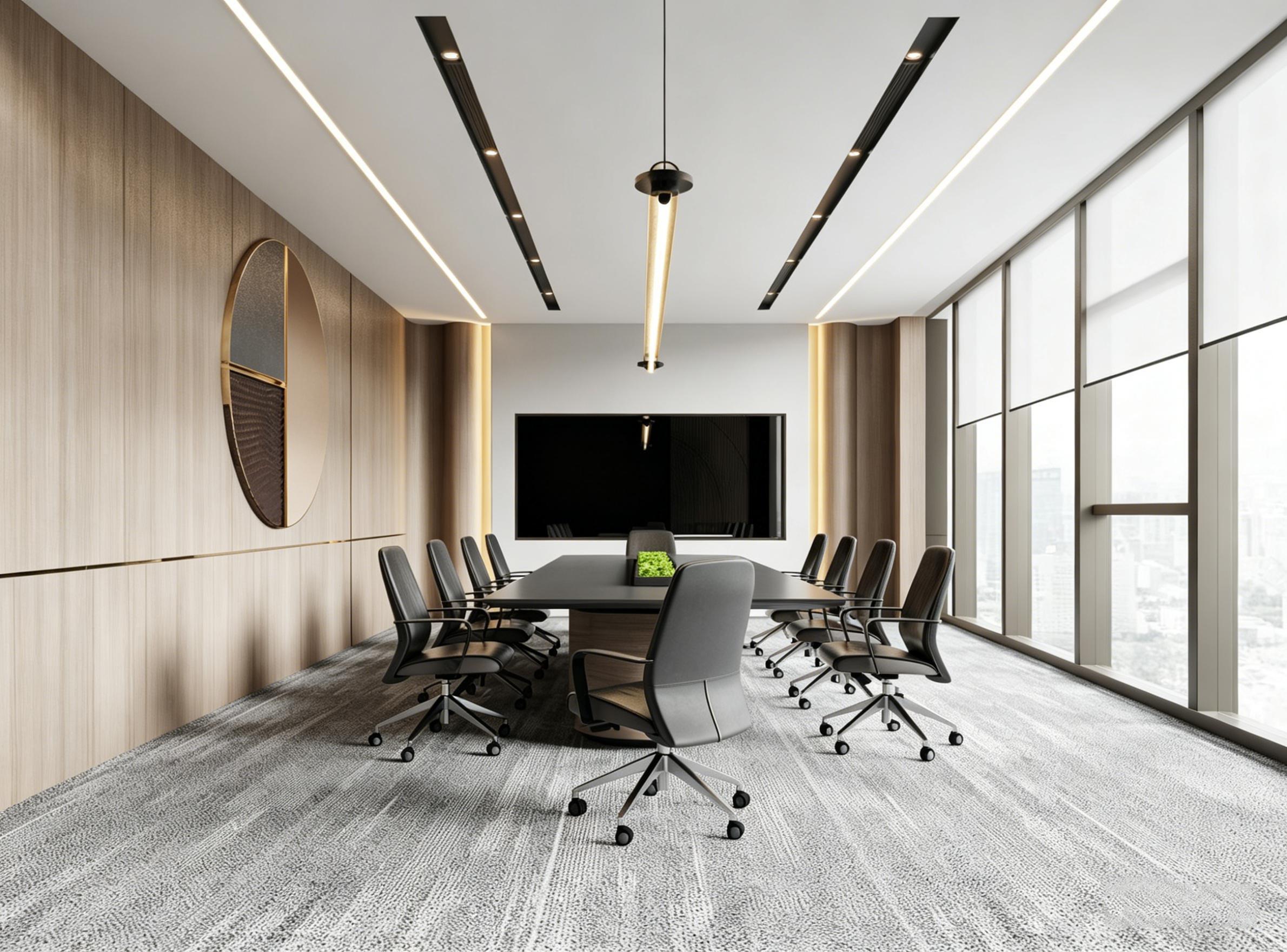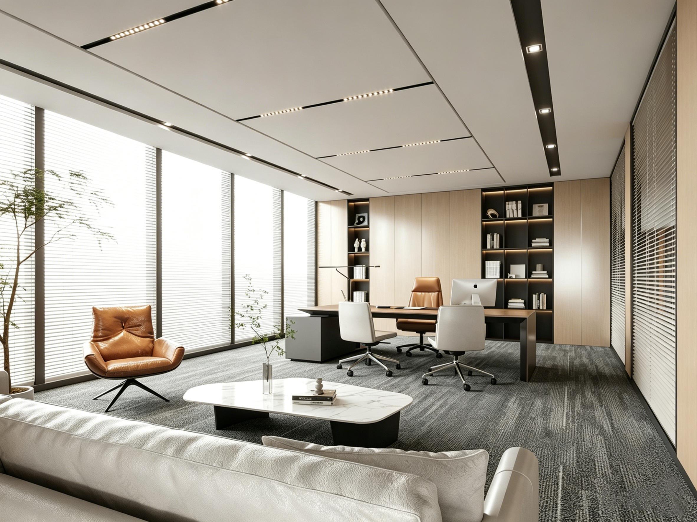 会议室延续了空间的统一语言,木饰面与线性灯光烘托出沉稳专业的氛围,超大落地窗引入城市景观,打破封闭感,让每一次头脑风暴都拥有开阔视野。而独立总裁办公室,则以皮质单椅、大理石茶几与整面收纳柜,构建出兼具商务洽谈与休憩放松的复合场景,百叶窗过滤自然光,营造出静谧且高效的专属办公氛围。