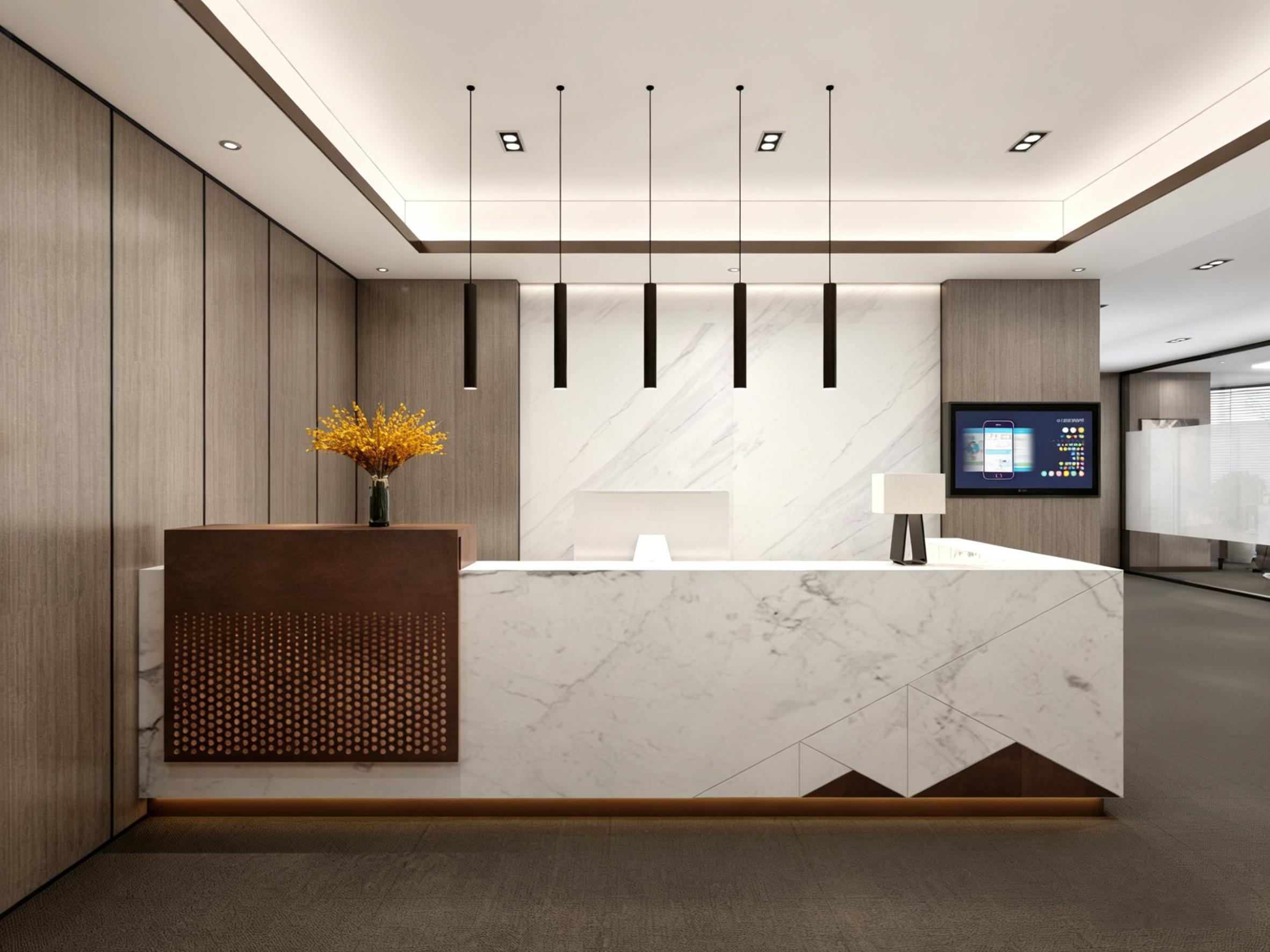 项目整体以浅木色与米白为基底,搭配深灰地毯与黑色金属线条,构建出克制而高级的极简调性。前台区域,大理石与金属冲孔板碰撞出精致质感,垂坠的线性灯与暖调花艺,让第一印象兼具商务礼仪与柔和温度,完美承接企业形象展示的核心功能。
