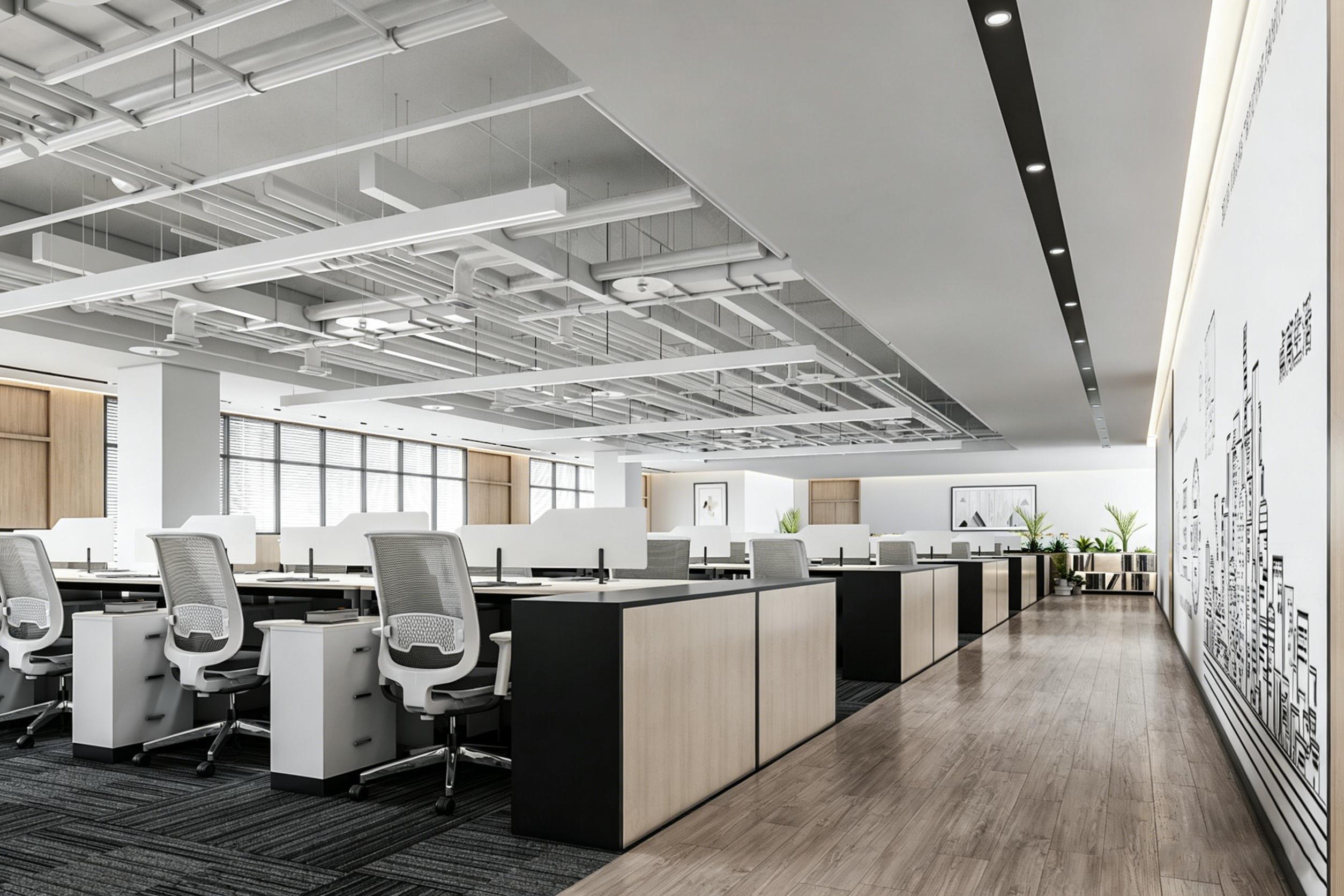 开放办公区以无主灯设计释放层高,裸露的管线与线性轨道灯打造出利落的工业感,模块化工位有序排布,浅木与黑的柜体搭配兼顾收纳与视觉整洁,墙面的线稿装饰为理性空间注入创意活力,让协作与专注互不干扰。