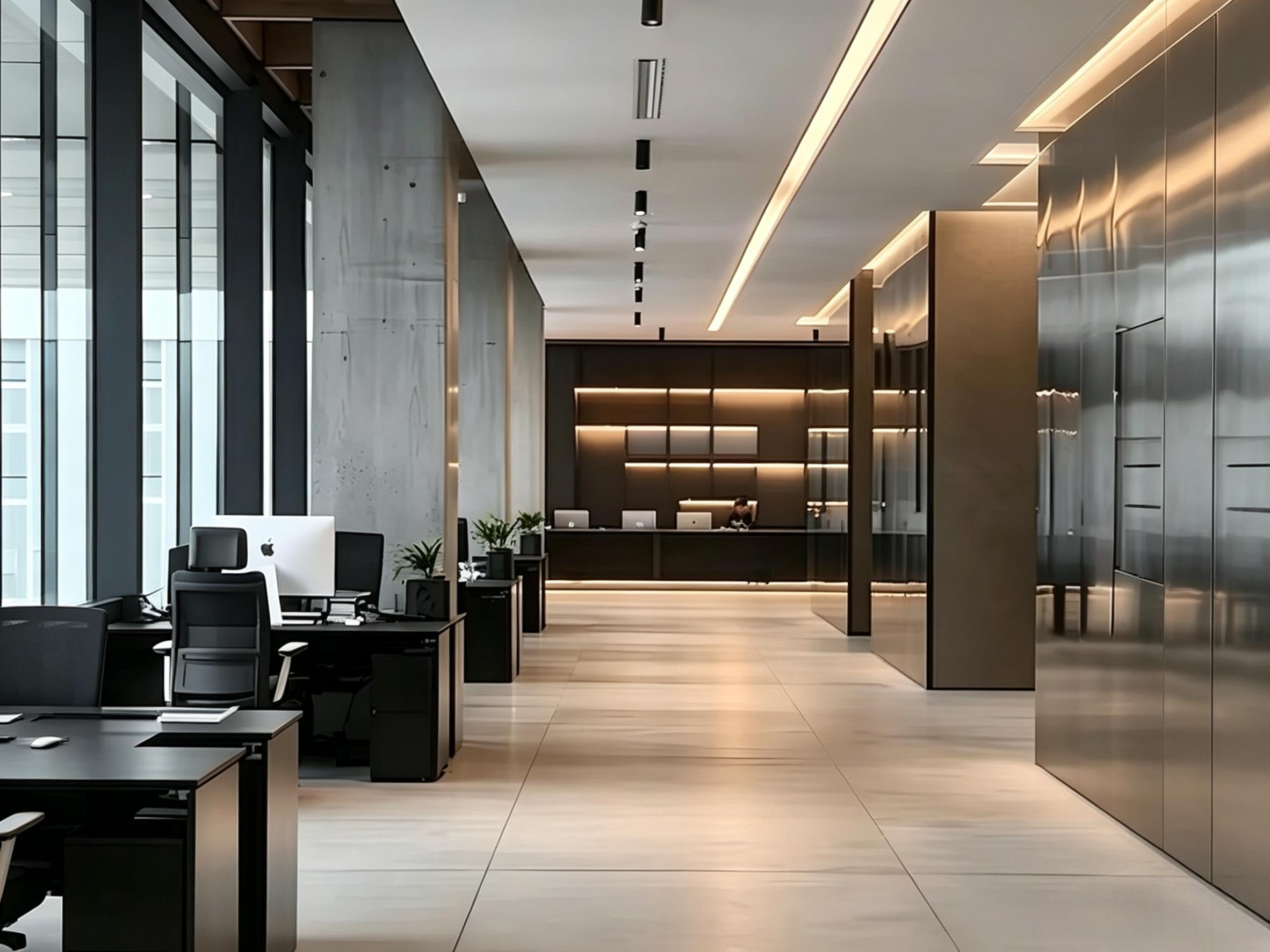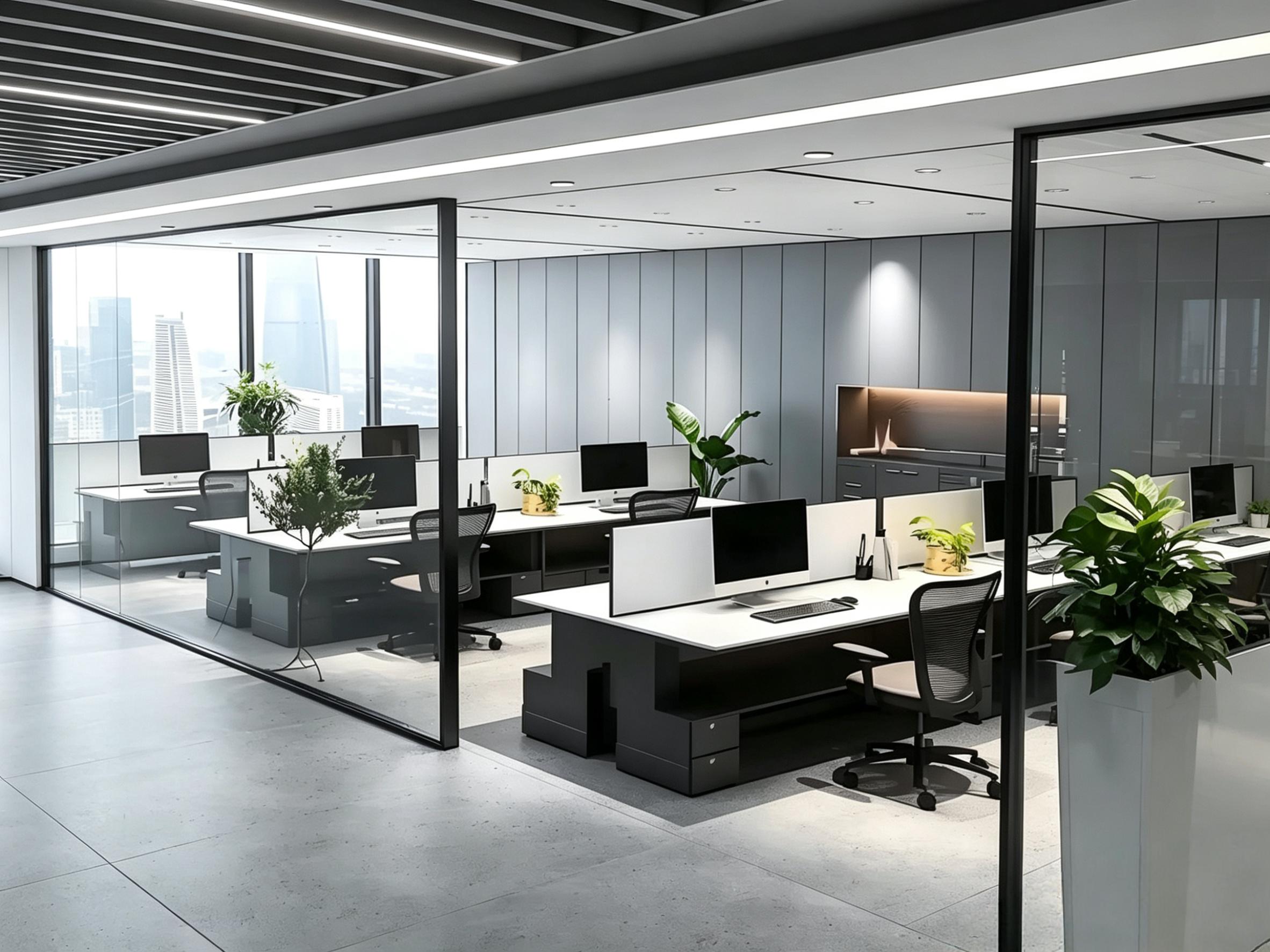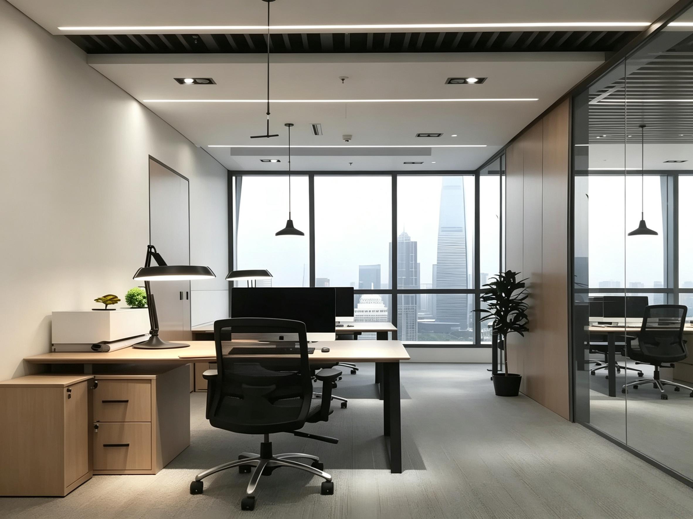 现代简约办公室的核心优势,首先体现在空间的通透感塑造上。从项目实景中可以看到,大面积的落地玻璃隔断替代了传统实墙,既划分出独立的办公工位、会议室与洽谈区,又保留了光线的自然流通。成都的城市天际线透过玻璃幕墙映入室内,搭配顶部线性灯与筒灯的组合照明,让整个办公区告别了传统办公室的逼仄压抑。