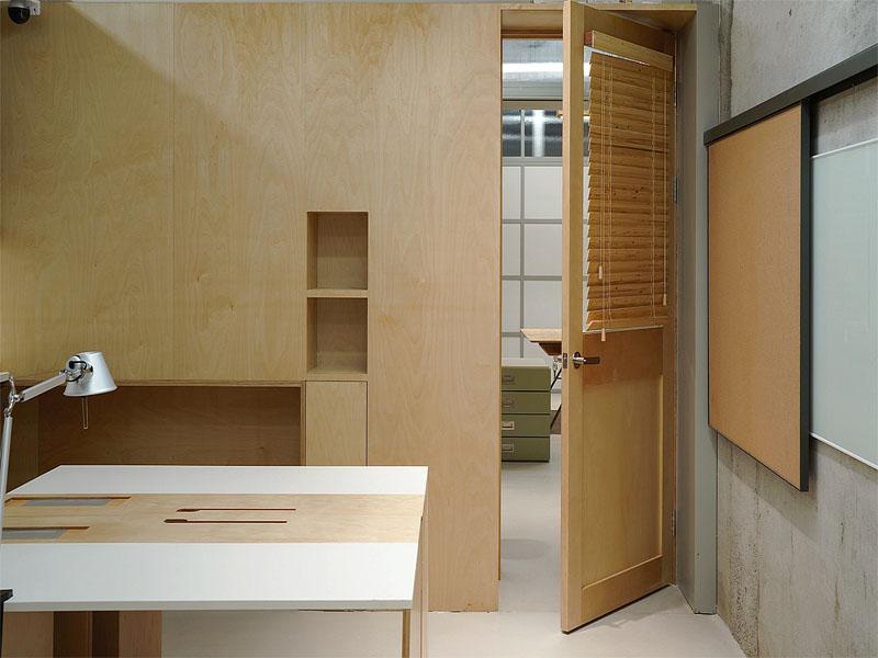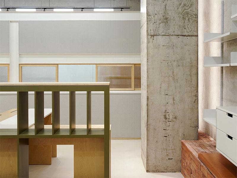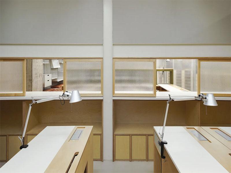 空间以浅原木色桦木胶合板为基底,搭配奶白色哑光地面与桌面,用温润的天然木纹消解了办公场景的紧绷感。裸露的水泥柱与红砖墙面,保留了建筑原始的粗犷质感,与原木的柔和形成鲜明对比,赋予空间独特的工业美学张力。长虹玻璃隔断是设计的点睛之笔,它将自然光过滤为柔和的漫射光,既保证了工位间的通透采光,又为每个区域保留了恰到好处的隐私,让专注与交流不再对立。